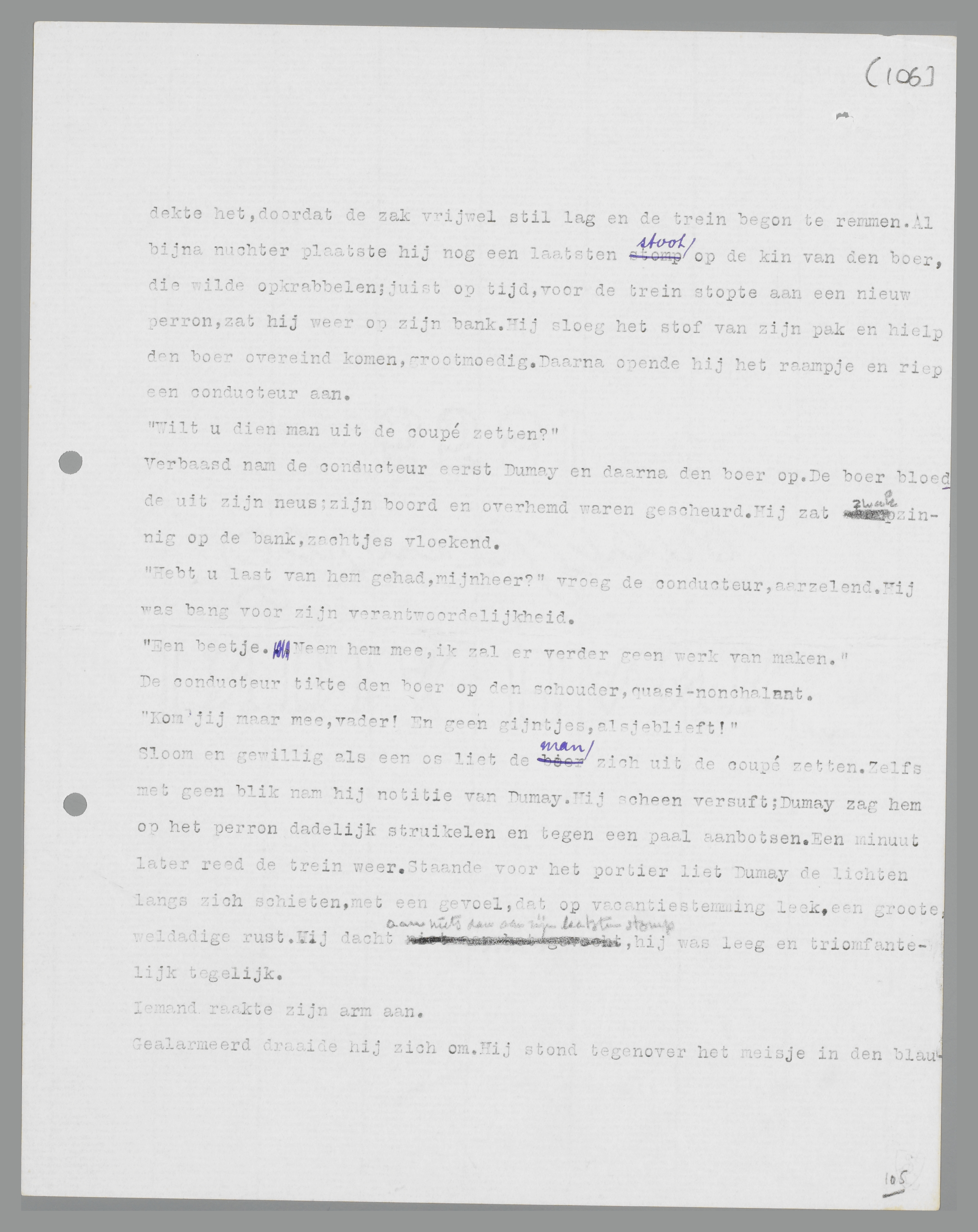 Met een hiklach sloeg de boer zijn arm om het meisje, dat niet gilde, alleen worstelde tegen die arm. Op hetzelfde ogenblik had Dumay een stomp uitgedeeld. Die stomp was op de neus van de boer terechtgekomen. En weer wachtte hij. Het handvat van de noodrem hing juist boven zijn hoofd, maar hij trok niet. Hij dacht er niet meer aan; hij was helder en hoorde het woord ‘belachelijk’ ongesproken in zichzelf. ‘Belachelijk, belachelijk!’ Hij zag het rode bakkes op zich afkomen en rook de jeneverwalm; met afschuw stompte hij opnieuw, recht in het opgezette gezicht; de zwarte sigaar vloog weg. Hij klemde zijn handen om een pappige hals, drukte op de adamsappel, kneep toe. ‘Belachelijk, belachelijk, belachelijk!’ Hij viel over iemand heen en stompte driemaal tegen iemands wang. Iemand vloekte, en trapte. Hij trapte in het wilde terug. Hij voelde, dat het zware lichaam meegaf, zich nauwelijks kon verzetten door de drank. Hij voelde meteen, dat hij moedig werd, ontzaglijk moedig. Hij rukte aan een boord, zag een boordeknoopje losspringen en wegrollen. Door alles heen, walgelijk en onafwendbaar, de jeneverlucht. En plotseling vond hij zichzelf liggen op een vreemde zak, stompend. Hij ontdekte het, doordat de zak vrijwel stil lag en de trein begon te remmen. Al bijna nuchter plaatste hij nog een laatste stoot op de kin van de boer, die wilde opkrabbelen; juist op tijd, voor de trein stopte aan een nieuw perron, zat hij weer op zijn bank. Hij sloeg het stof van zijn pak en hielp de boer overeind komen, grootmoedig. Daarna opende hij het raampje en riep een conducteur aan.