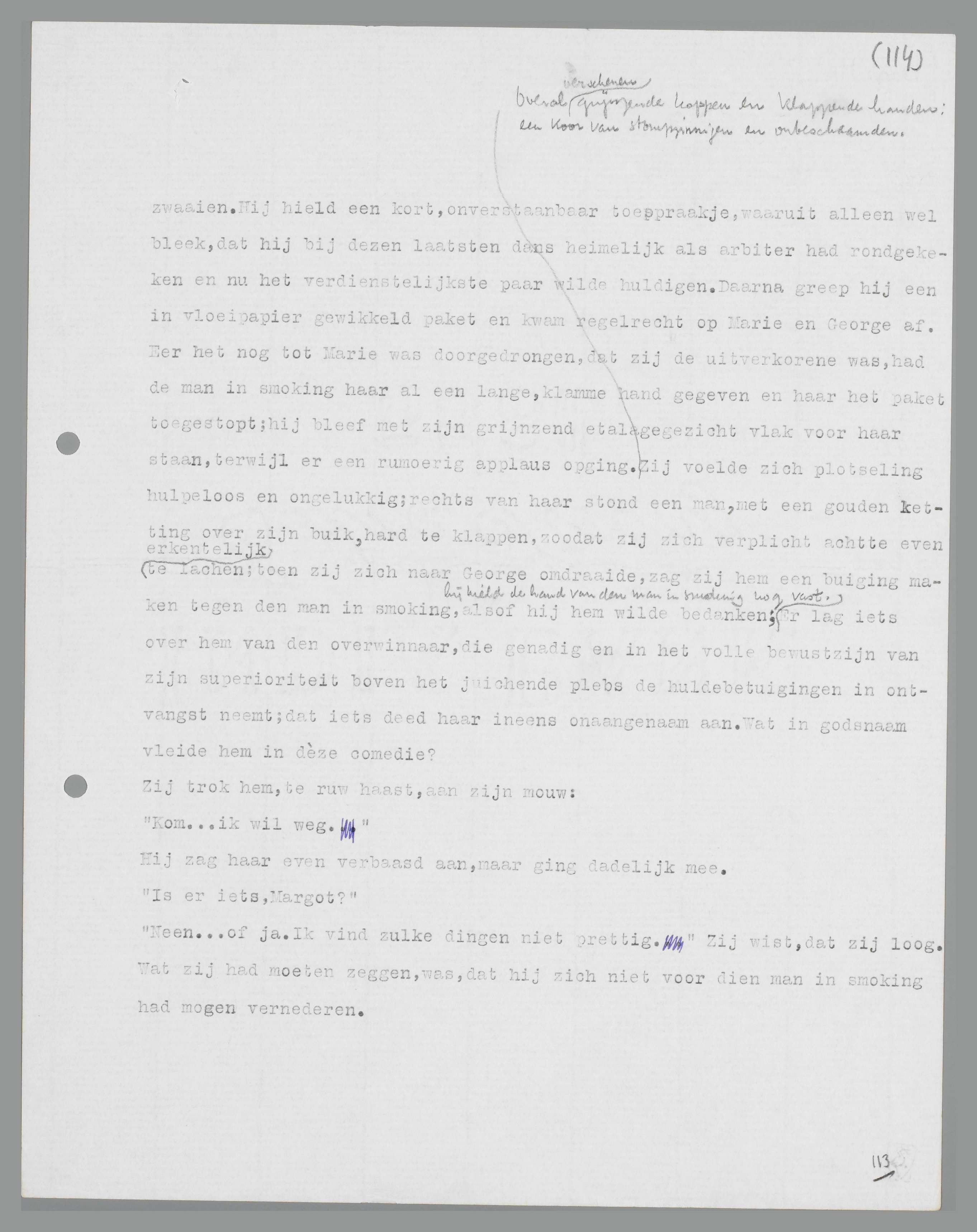 Zij sloegen geen dans over. De dancing was vol, maar het hinderde hen niet erg; George danste met toewijding en een onmerkbaar meesterschap; hij overdreef niets, maar gaf onberispelijk leiding. Als hij, buiten zijn schuld, even in botsing kwam met een stuntelig paar, fronste hij zijn wenkbrauwen, alsof hij zijn belagers wilde aanklagen. Hij danste niet met te veel vuur noch te gewild achteloos; op zijn stijl was niets aan te merken. Er kwam een tango, die George weer herkennend deed glimlachen; zij dansten die tango beiden met de wens, dat het einde niet spoedig zou komen. Maar het einde kwam niettemin; en bij het wegsterven van de laatste klank gebood de man in smoking stilte door met zijn armen te zwaaien. Hij hield een kort, onverstaanbaar toespraakje, waaruit alleen wel bleek, dat hij bij deze laatste dans heimelijk als arbiter had rondgekeken en nu het verdienstelijkste paar wilde huldigen. Daarna greep hij een in vloeipapier gewikkeld pakket en kwam regelrecht op Marie en George af. Eer het nog tot Marie was doorgedrongen, dat zij de uitverkorene was, had de man in smoking haar al een lange, klamme hand gegeven en haar het pakket toegestopt; hij bleef met zijn grijnzend etalagegezicht vlak voor haar staan, terwijl er een rumoerig applaus opging. Overal verschenen grijnzende koppen en klappende handen: een koor van stompzinnigen en onbeschaamden. Zij voelde zich plotseling hulpeloos en ongelukkig; rechts van haar stond een man, met een gouden ketting over zijn buik, hard te klappen, zodat zij zich verplicht achtte even erkentelijk te lachen; toen zij zich naar George omdraaide, zag zij hem een buiging maken tegen de man in smoking, alsof hij hem wilde bedanken; hij hield de hand van de man in smoking nog vast. Er lag iets over hem van de overwinnaar, die genadig en in het volle bewustzijn van zijn superioriteit boven het juichende plebs de huldebetuigingen in ontvangst neemt; dat iets deed haar ineens onaangenaam aan. Wat in godsnaam vleide hem in déze comedie?