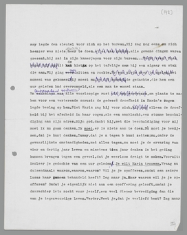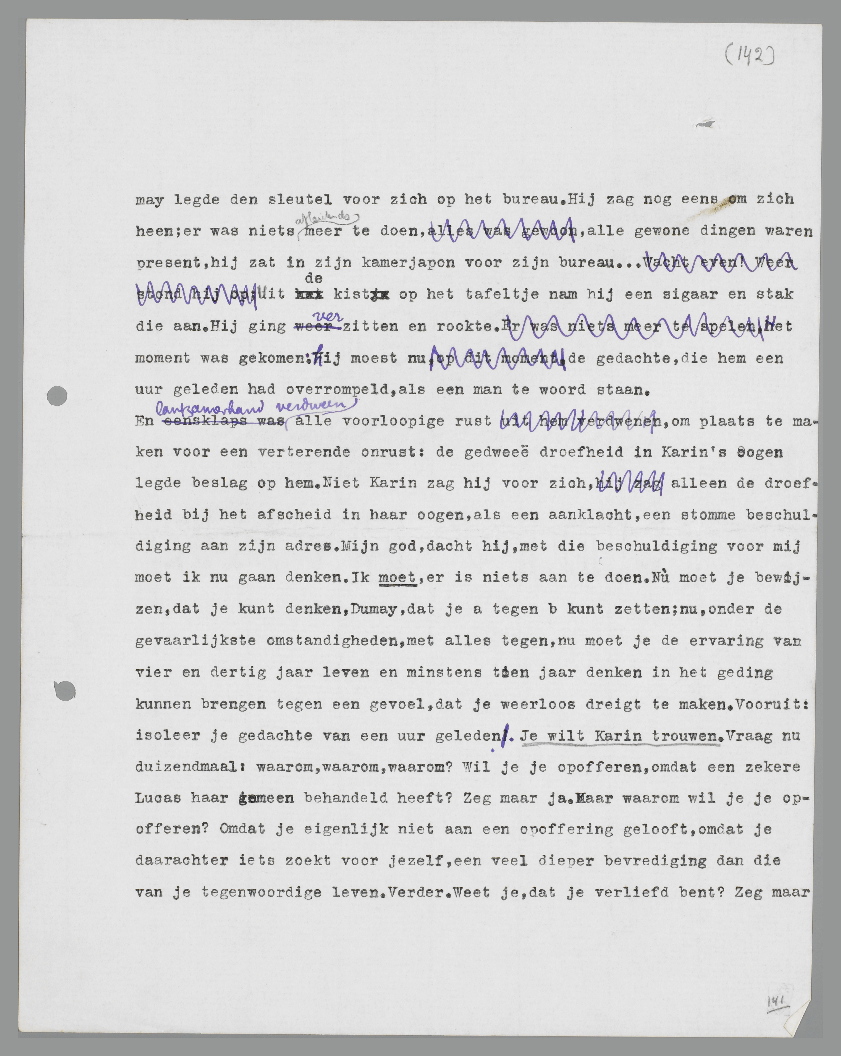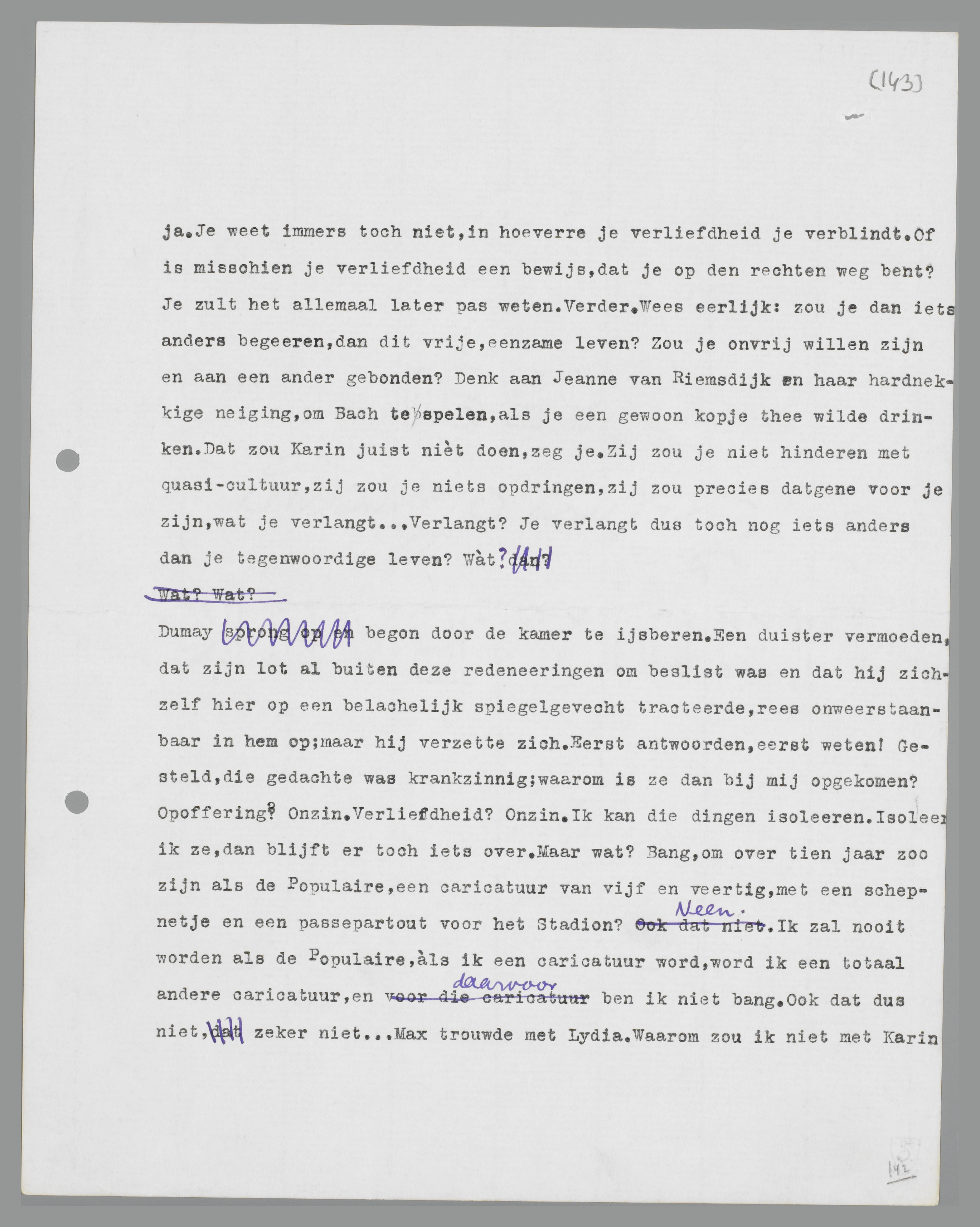 ik een caricatuur word, word ik een totaal andere caricatuur, en daarvoor ben ik niet bang. Ook dat dus niet, zeker niet. ... Max trouwde met Lydia. Waarom zou ik niet met Karin trouwen? Halt, dat is geen argument. Dat is een argument tegen. Een beetje minnaar, een beetje papa, enz., dat gaat voor jou èn Karin niet op! Maar toch: denk eens aan Max, aan zijn vroegere avonturen! Hoe gewoon is hij geworden, hoeveel beter staat hem deze levenswijze! En wat hij kan, zou jìj niet kunnen? Natuurlijk kun je het; je kunt het beter, je kunt Max nog een lesje geven in dit opzicht. Hìj nam een vrouw met een schijn van cultuur, omdat hij die schijn niet kan missen; jìj kunt een vrouw nemen, die ronduit niets anders is dan een vrouw, die niets begrijpt en nooit iets zàl begrijpen. Is dat niet het enig mogelijke voor een man als jij, is dat niet het enig reële, dat er voor jou bestaat? ... Maar beste jongen, dan is het immers onnodig om te trouwen? Waarom dan die idée fixe van het huwelijk? Omdat een zekere Lucas Karin gemeen behandeld heeft. Dus een opoffering. Op dat punt was ik straks al. Is het werkelijk zo? Of: zou het misschien buitengewoon simpel zijn? Zou ik ... van Karin houden, zou dit bijgevoel van opoffering misschien datgene zijn waarover zoveel woorden worden vuilgemaakt? Zou dit de laatste stap kunnen zijn naar het gewone menselijke leven, waarnaar ik altijd heb verlangd? Karin, een gewone vrouw; eindelijk een vrouw zonder schijnvertoning van ideeën, die na een maand louter aanwensel of diplomatie blijken te zijn! Zou ik werkelijk ... van Karin houden, zonder meer? Of is dit het sluwste zelfbedrog, het allersluwste, dat ik mijzelf ooit heb aangedaan?