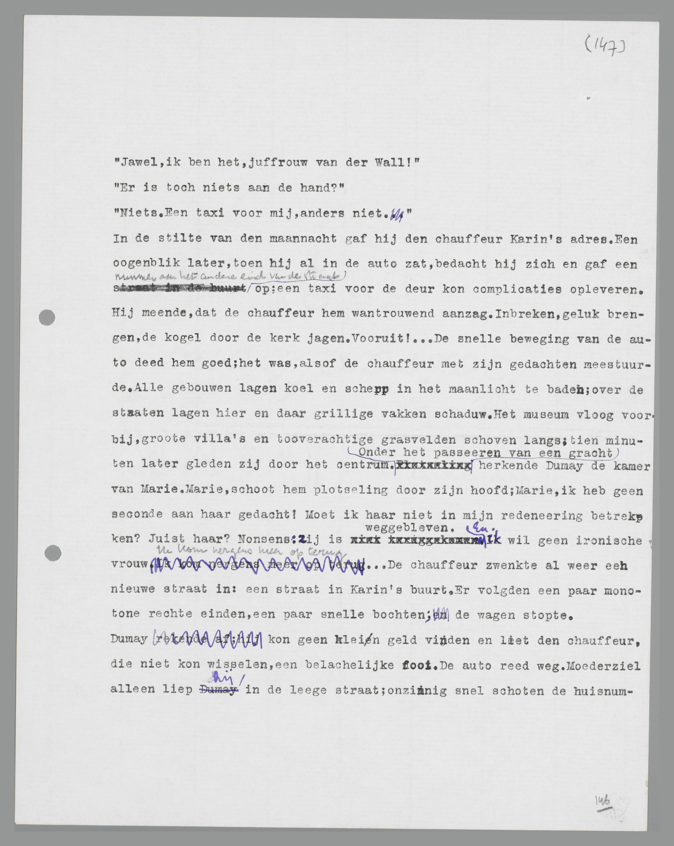 In de stilte van de maannacht gaf hij de chauffeur Karins adres. Een ogenblik later, toen hij al in de auto zat, bedacht hij zich en gaf een nummer aan het andere eind van de straat op; een taxi voor de deur kon complicaties opleveren. Hij meende, dat de chauffeur hem wantrouwend aanzag. Inbreken, geluk brengen, de kogel door de kerk jagen. Vooruit! ... De snelle beweging van de auto deed hem goed; het was, alsof de chauffeur met zijn gedachten meestuurde. Alle gebouwen lagen koel en scherp in het maanlicht te baden; over de straten lagen hier en daar grillige vakken schaduw. Het museum vloog voorbij, grote villa's en toverachtige grasvelden schoven langs; tien minuten later gleden zij door het centrum. Onder het passeren van een gracht herkende Dumay de kamer van Marie. Marie, schoot hem plotseling door zijn hoofd; Marie, ik heb geen seconde aan haar gedacht! Moet ik haar niet in mijn redenering betrekken? Juist haar? Nonsens: zij is weggebleven. En ik wil geen ironische vrouw. Ik kom nergens meer op terug. ... De chauffeur zwenkte al weer een nieuwe straat in: een straat in Karins buurt. Er volgden een paar monotone, rechte einden, een paar snelle bochten; de wagen stopte.