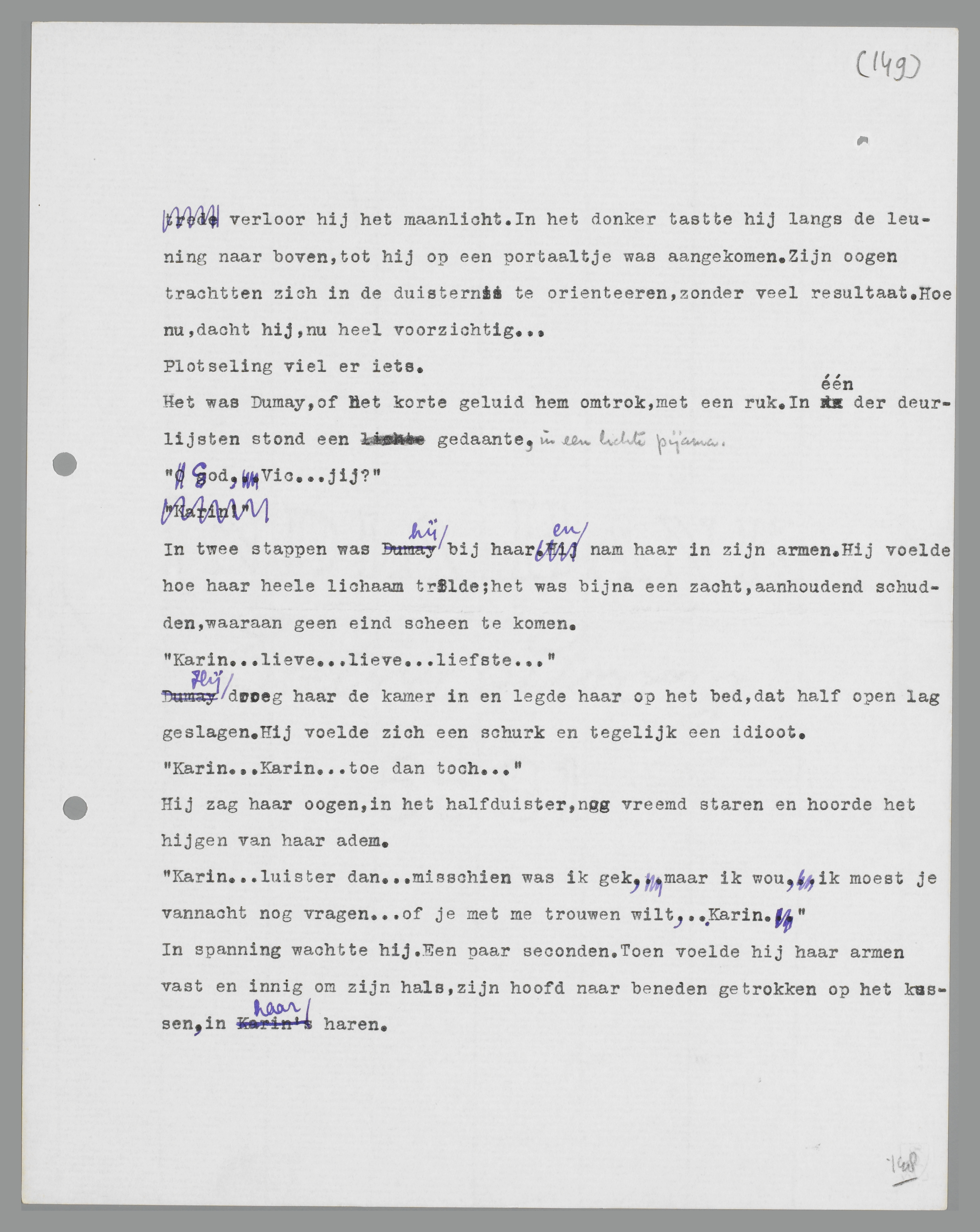 Hij stond weer op en zocht zijn kamerjapon. De gedachte waakte achter zijn voorhoofd en wachtte, tot hij gereed zou zijn voor de confrontatie. Bij het aanschieten van de kamerjapon voelde hij iets hards in de zak van zijn colbert, dat daar niet behoorde te zijn: het was de sleutel van Karins huisdeur, die hij vergeten had terug te geven. Een lange, spichtige sleutel met een nijdige snavel. Hij tikte er mee tegen de glazen bol, die met een heldere kristalklank antwoordde. Als ik nu nog driemaal tik en de bol geeft driemaal dezelfde klank, dan zal ik geluk hebben, dacht hij. De bol gaf driemaal dezelfde heldere klank. Dumay legde de sleutel voor zich op het bureau. Hij zag nog eens om zich heen; er was niets afleidends meer te doen, alle gewone dingen waren present, hij zat in zijn kamerjapon voor zijn bureau. ... Uit de kist op het tafeltje nam hij een sigaar en stak die aan. Hij ging verzitten en rookte. Het moment was gekomen: hij moest nu de gedachte, die hem een uur geleden had overrompeld, als een man te woord staan.