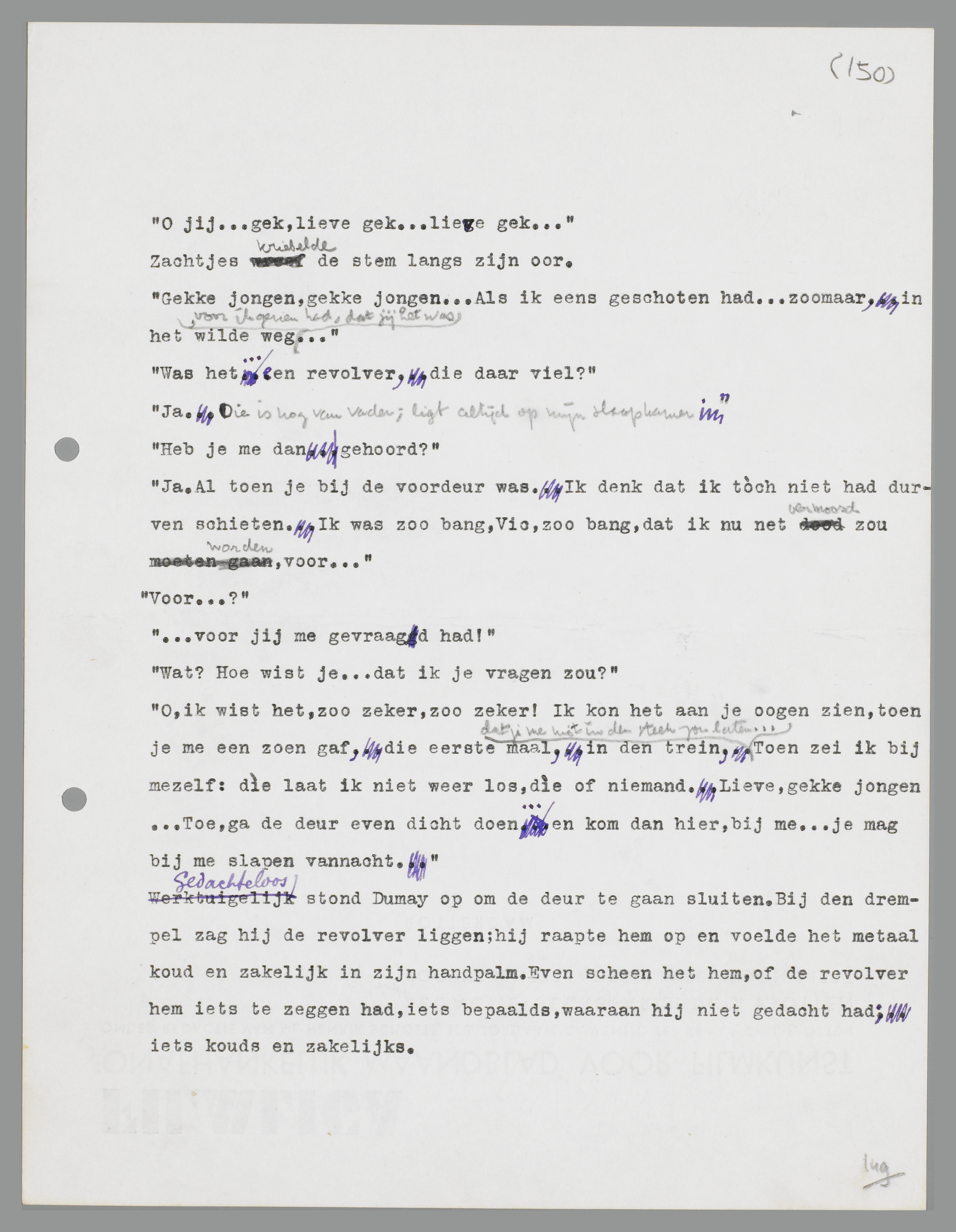 Gedachteloos stond Dumay op om de deur te gaan sluiten. Bij de drempel zag hij de revolver liggen; hij raapte hem op en voelde het metaal koud en zakelijk in zijn handpalm. Even scheen het hem, of de revolver hem iets te zeggen had, iets bepaalds, waaraan hij niet gedacht had; iets kouds en zakelijks.
