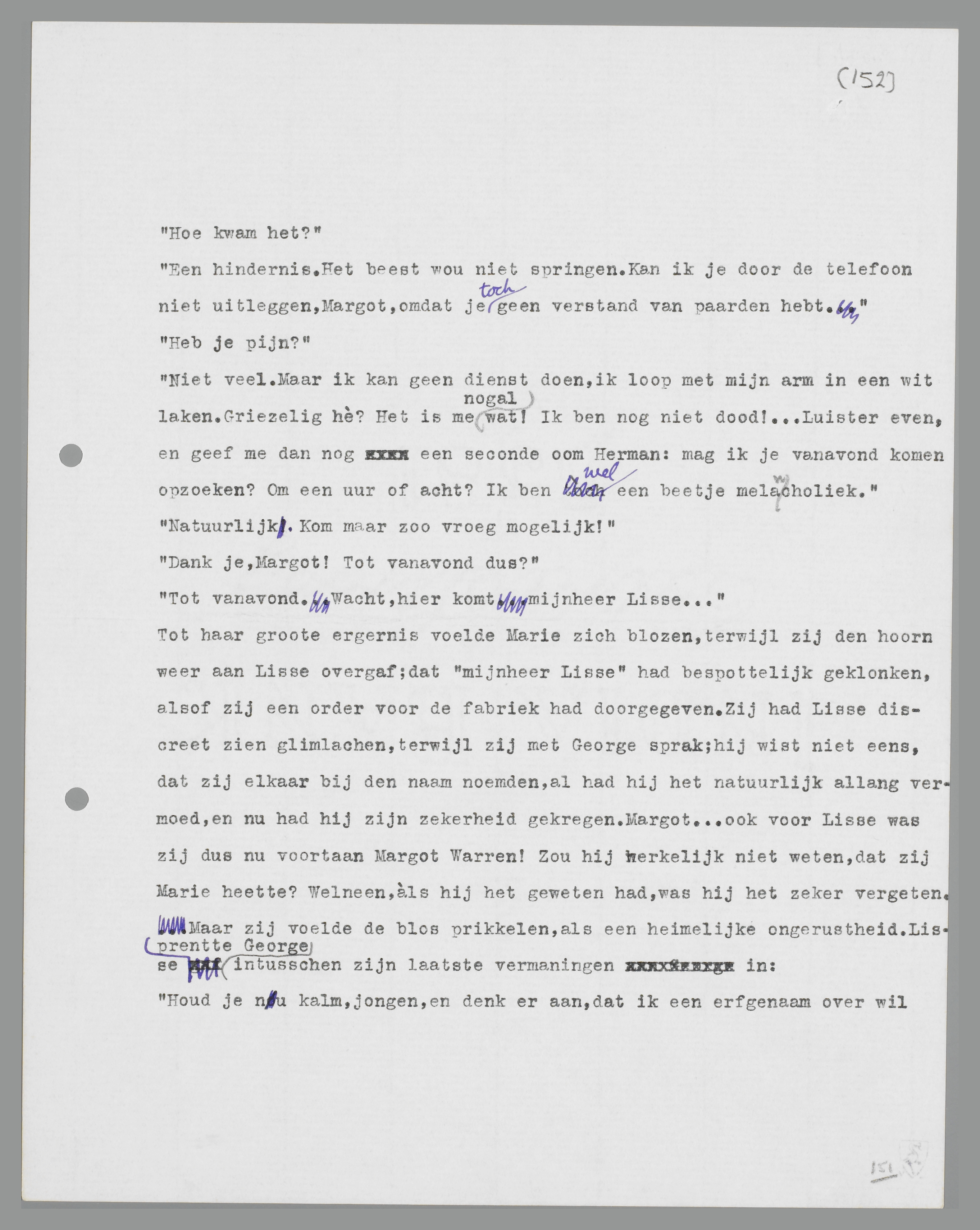 Marie had geveinsd, verdiept te zijn in de brief, waaraan zij juist bezig was, toen de telefoon overging; maar toen Lisse's stem plotseling ernstig en bezorgd had geklonken, was zij geschrokken: George, er is iets met George. ... Zij nam de hoorn haastig van Lisse over: