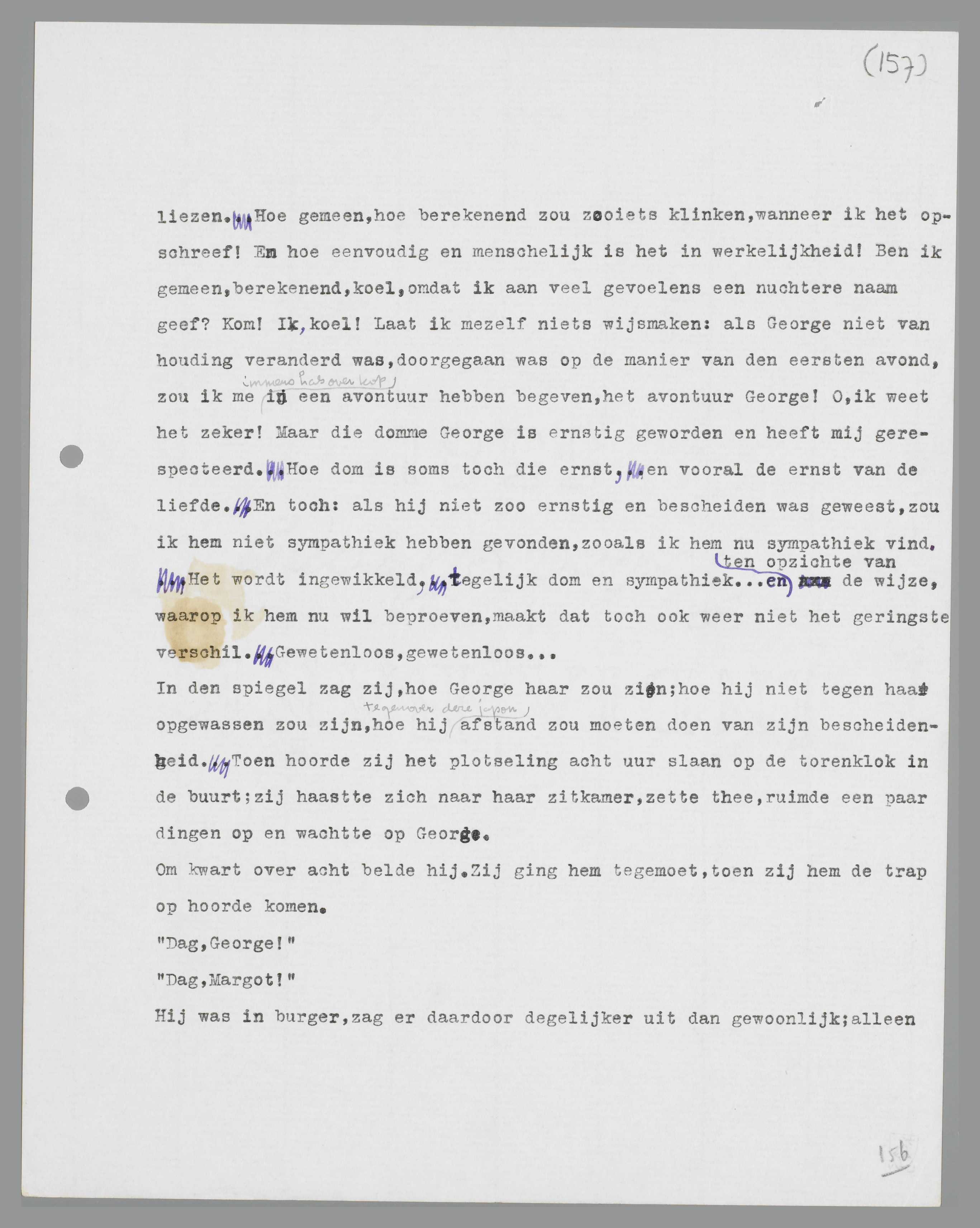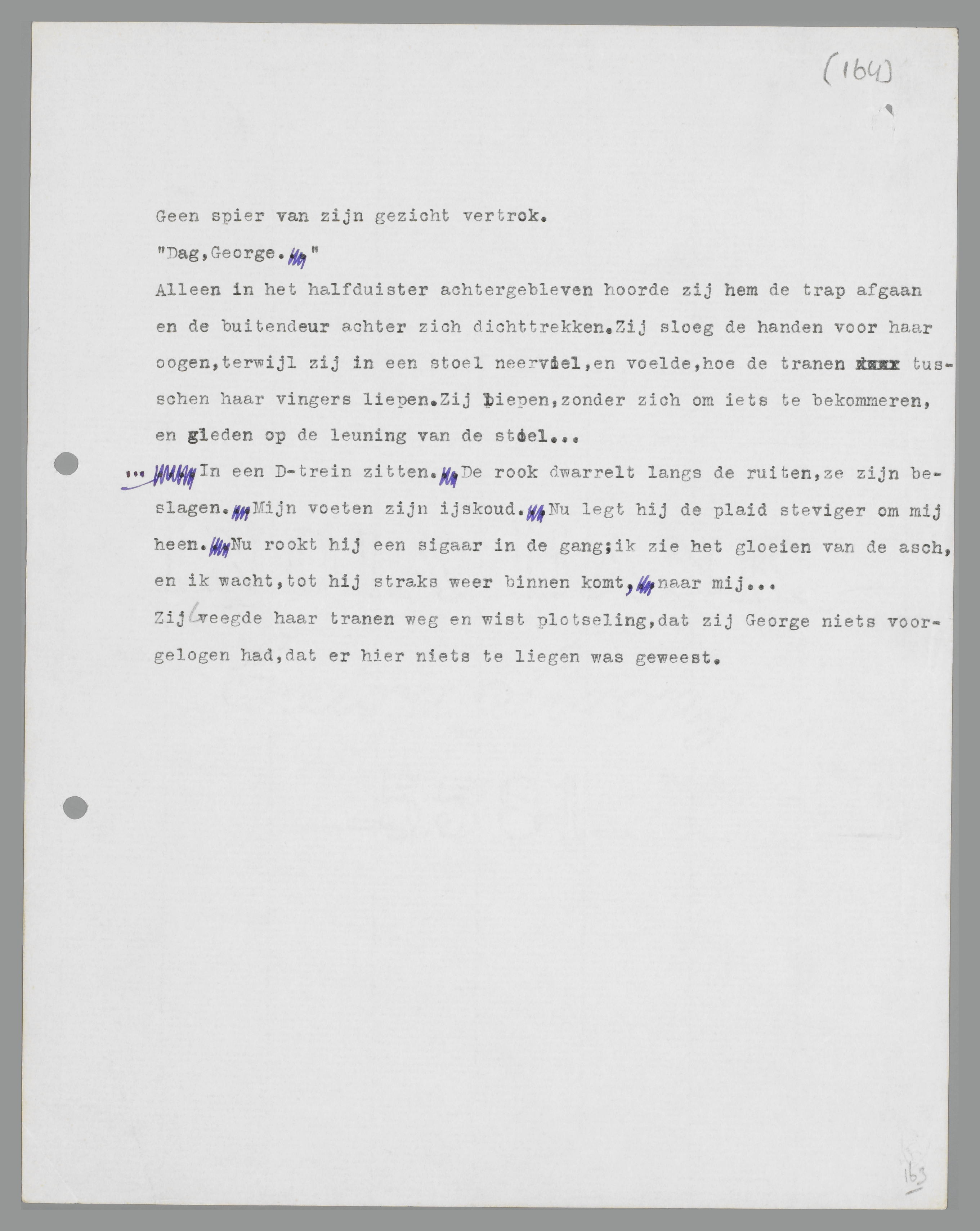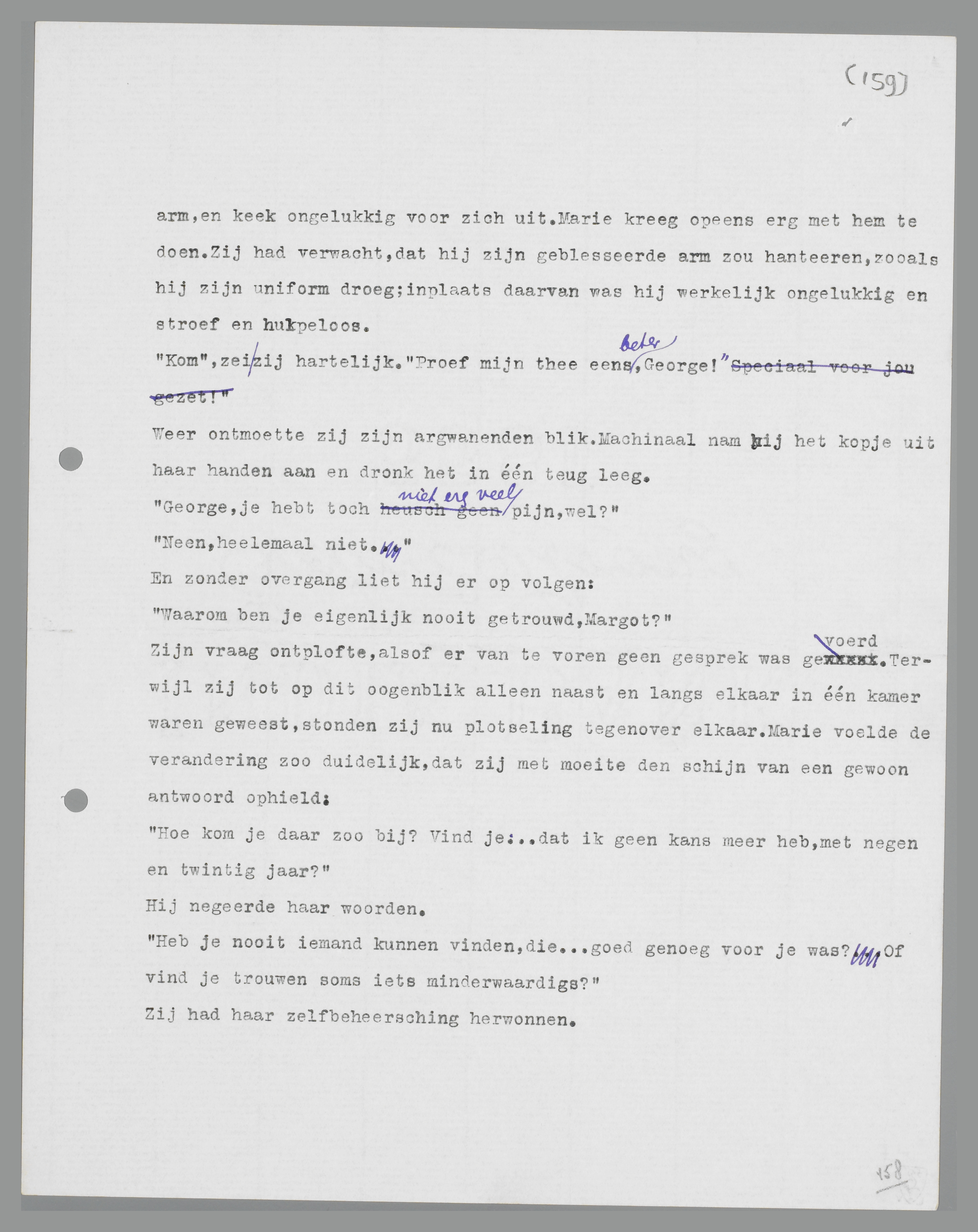 Zij zag zijn gezicht veranderen, in een paar seconden; het werd strak, militair, ingehouden. Nu voelt hij alles, wat hij gezegd heeft over hysterie en boeken bewezen, dacht zij, starend naar zijn gezicht. Nu heeft hij een tegenwicht, iets, dat hem, nu al, steun geeft. Hij heeft mij verslagen, hij is overwinnaar gebleven; dat is het eerste tegenwicht. ... Haar ogen werden nat, een traan liep verraderlijk over haar wang; zij veegde hem weg, voor George hem gezien had. Hij keek naar een punt op het vloerkleed, hard en gesloten. Toen stak hij haar abrupt zijn linkerhand toe:
