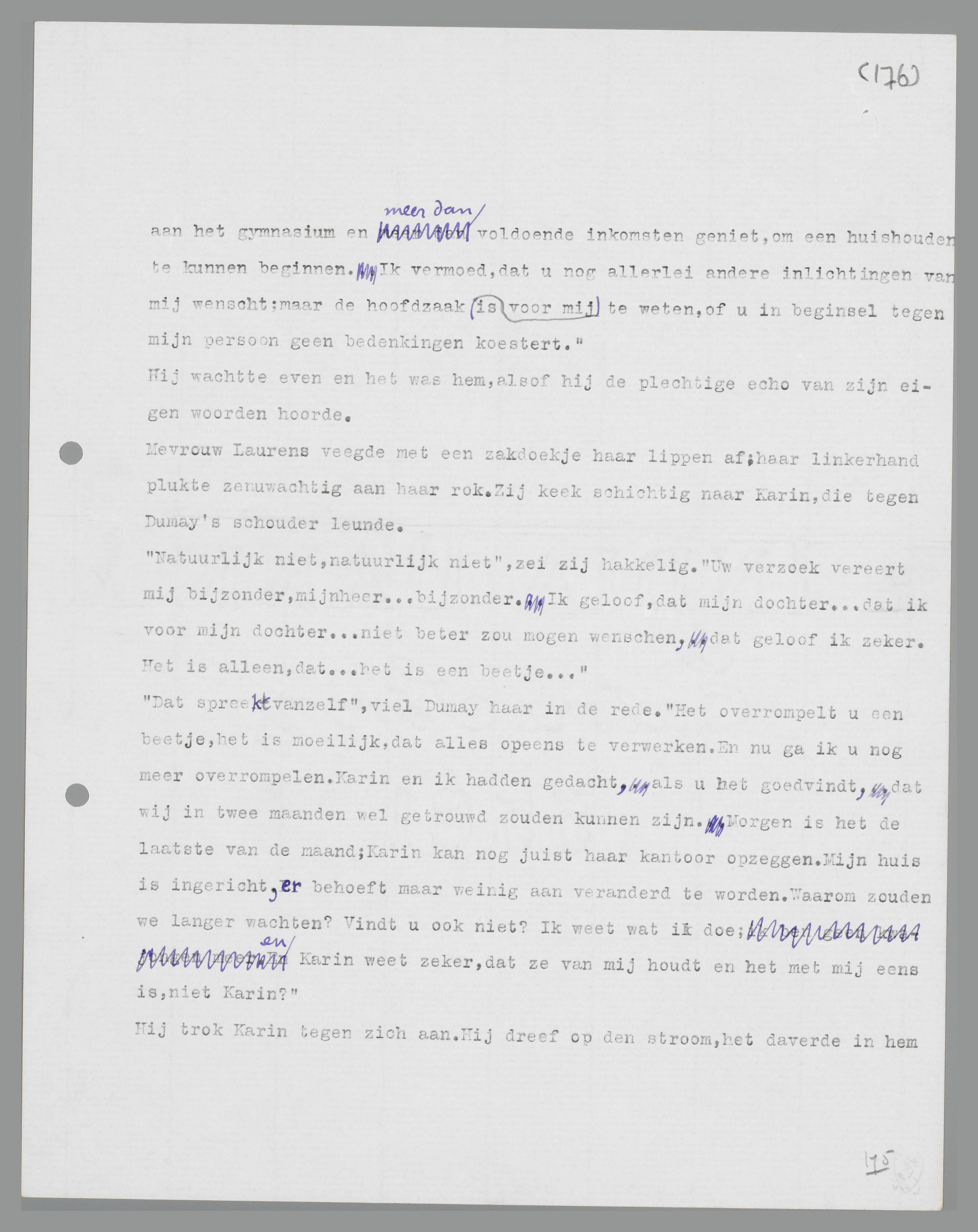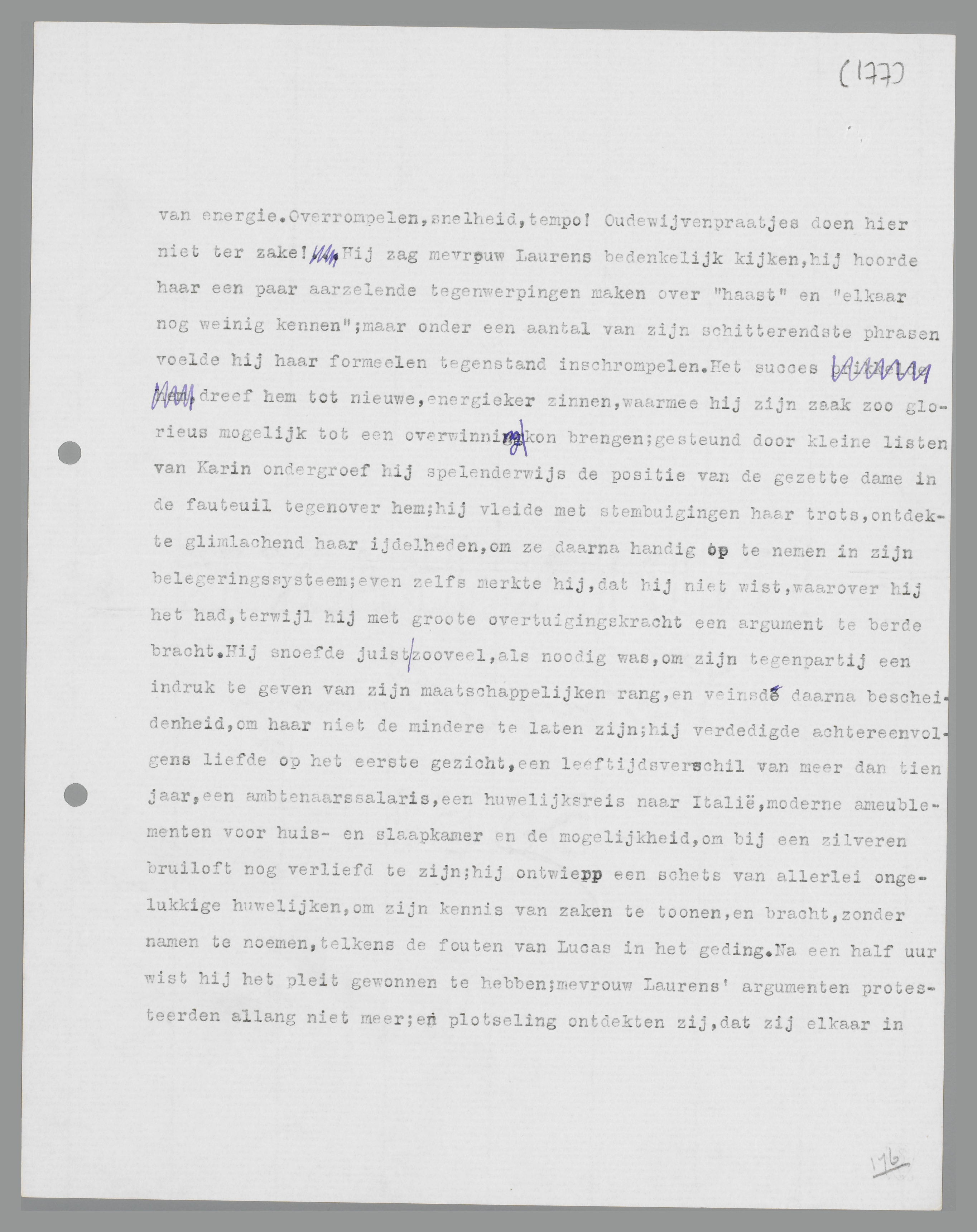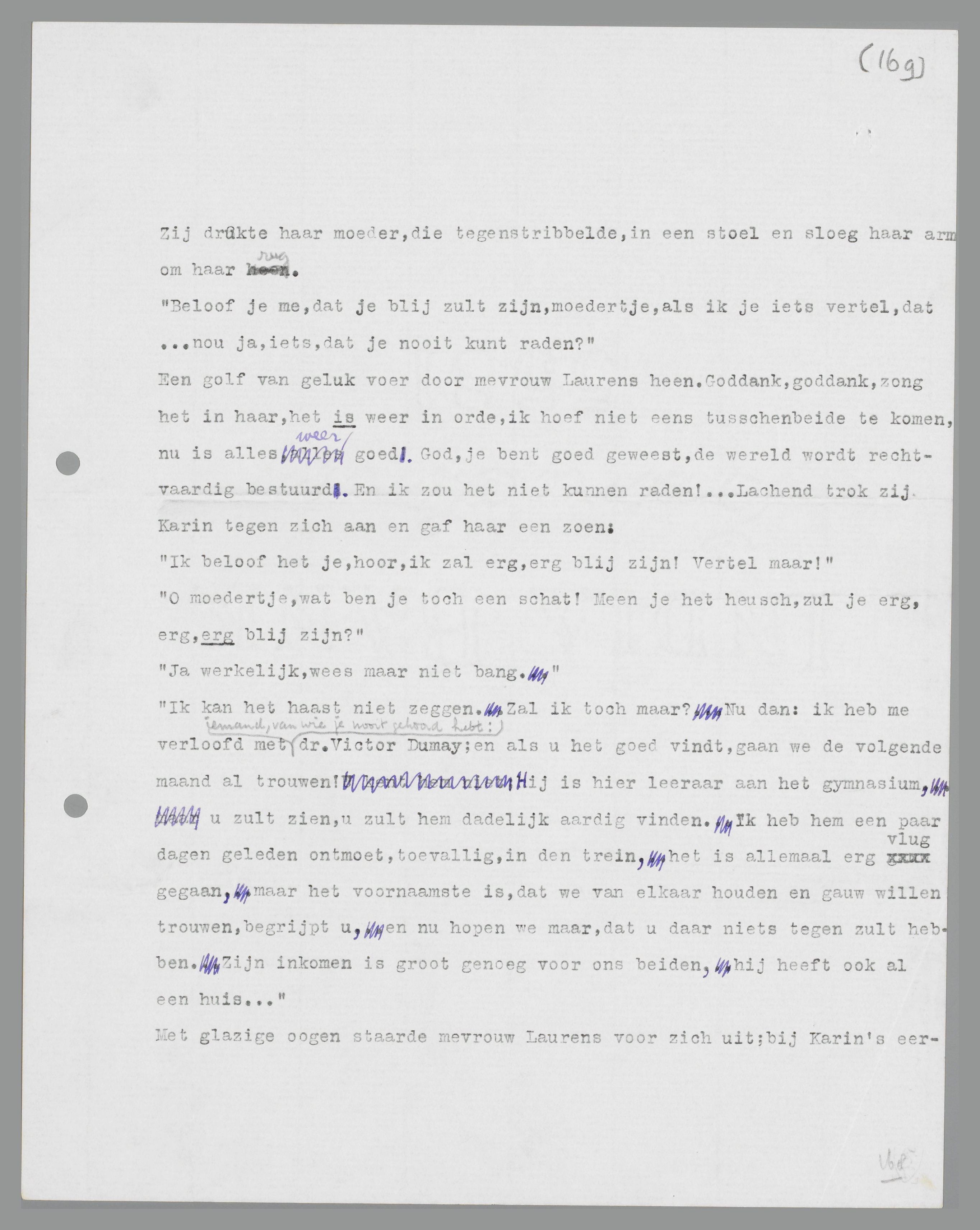 Zorgvuldig inspecteerde mevrouw Laurens haar huiskamer; hier en daar blies zij wat stof weg; dat moest zij altijd doen, als zij een nacht van huis geweest was, want Karin wuifde maar wat met de stofdoek, als zij 's morgens naar kantoor moest. Zo was Karin nu eenmaal, dat had zij misschien van haar vader; die had het er soms ook maar op aan laten komen. ... Mevrouw Laurens blies langs de lijst van het portret van haar man. Maar een goede vader zou hij geweest zijn, met hart voor zijn kind; dat had Nel ook nog gezegd. ... Nel had alles dadelijk begrepen, van Lucas en Karin. ‘Ik heb ook een verloofde dochter,’ had zij gezegd. ‘Zulke dingen komen in orde, als je het een beetje handig aanlegt.’