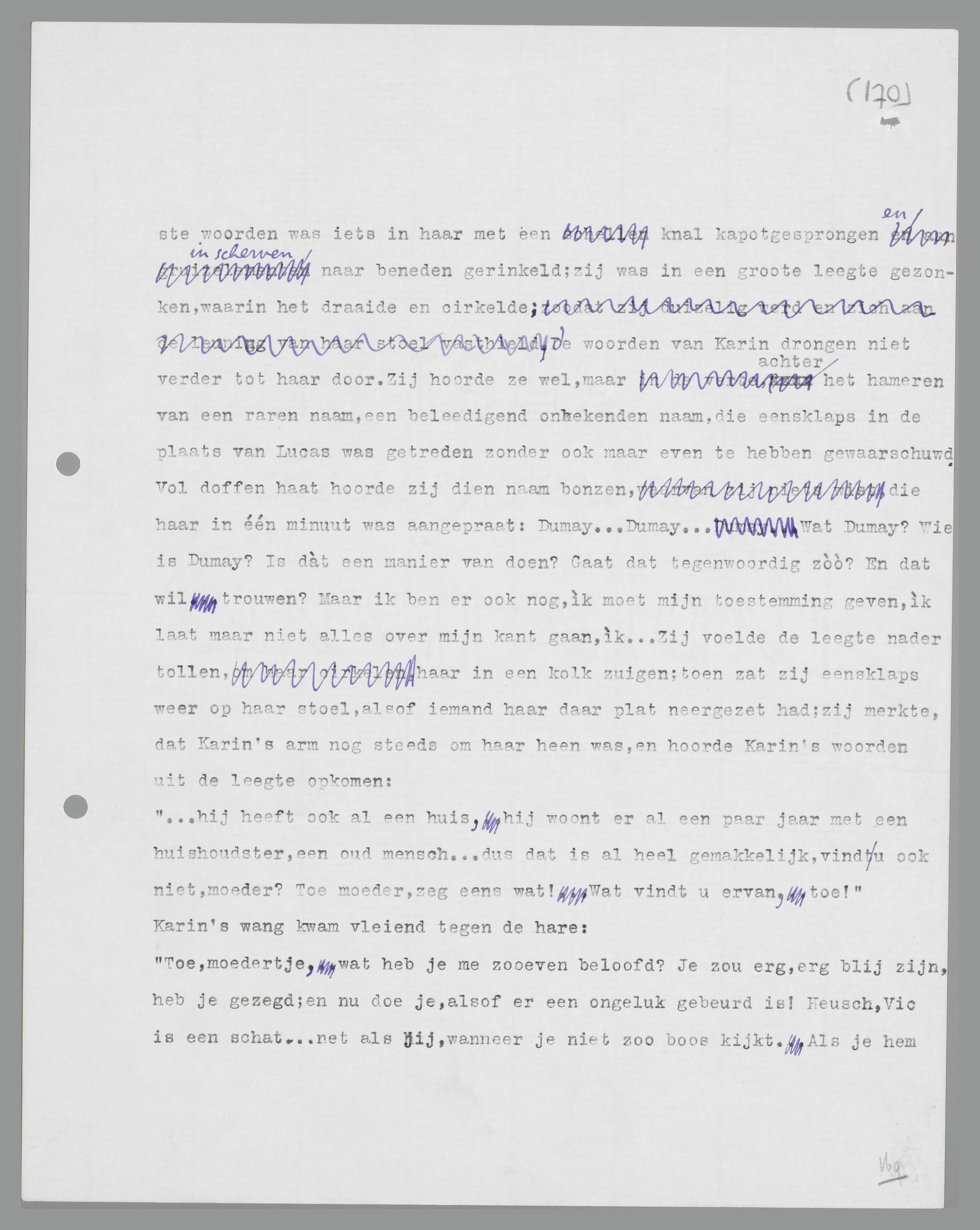 Mevrouw Laurens trachtte Karins liefkozingen af te weren. In haar hoofd cirkelde het nog steeds; telkens dook het gezicht van Lucas op om dan weer weg te schieten achter de hatelijke naam. En onophoudelijk keerde de éne gedachte terug, als een vlijmende steek: het is buiten mij om gegaan, ik heb er niets van geweten, ze hebben me bedrogen en ik heb me bij de neus laten nemen! Dumee! Ik ken geen Dumee! ... Zij vermande zich eindelijk en zei effen: