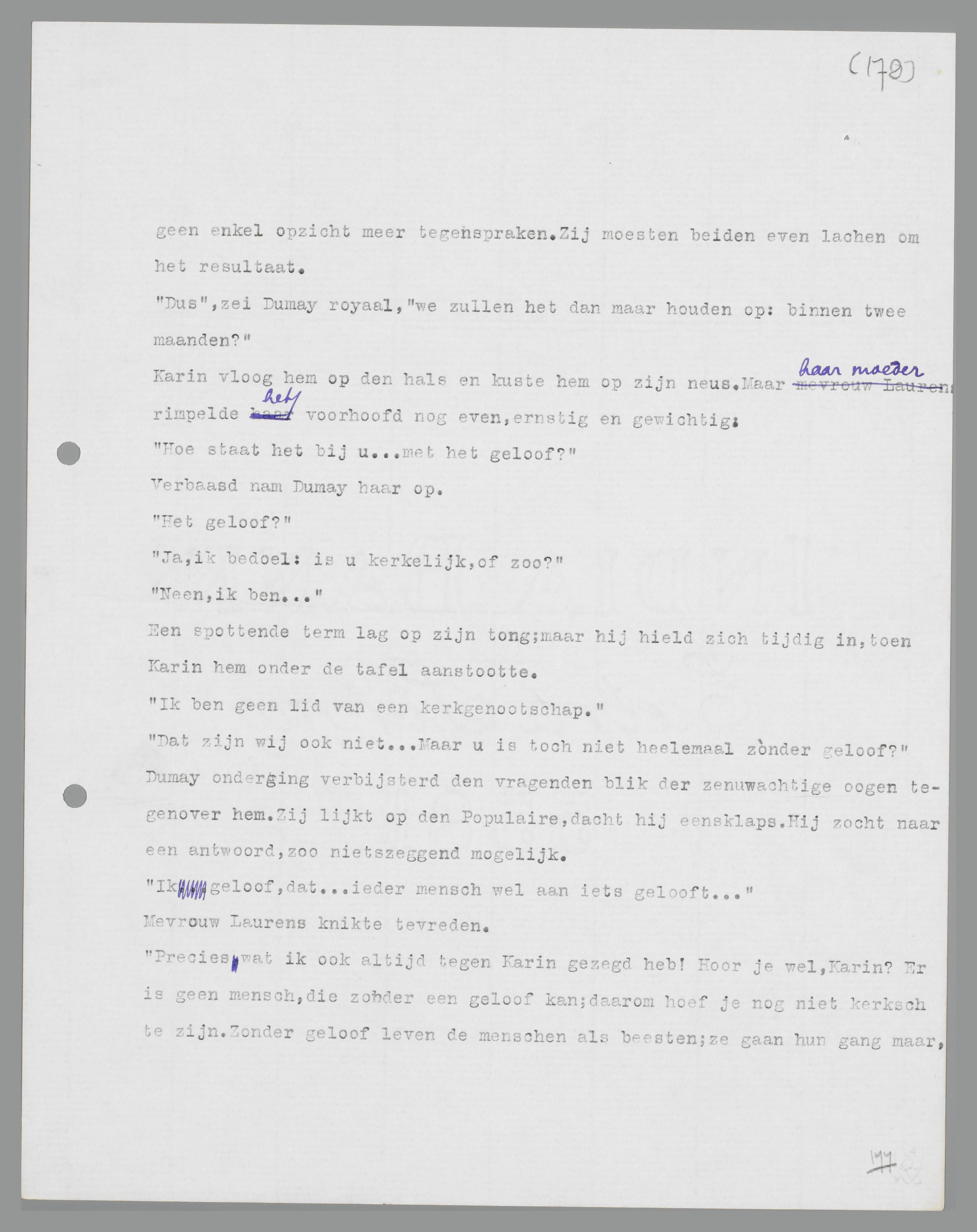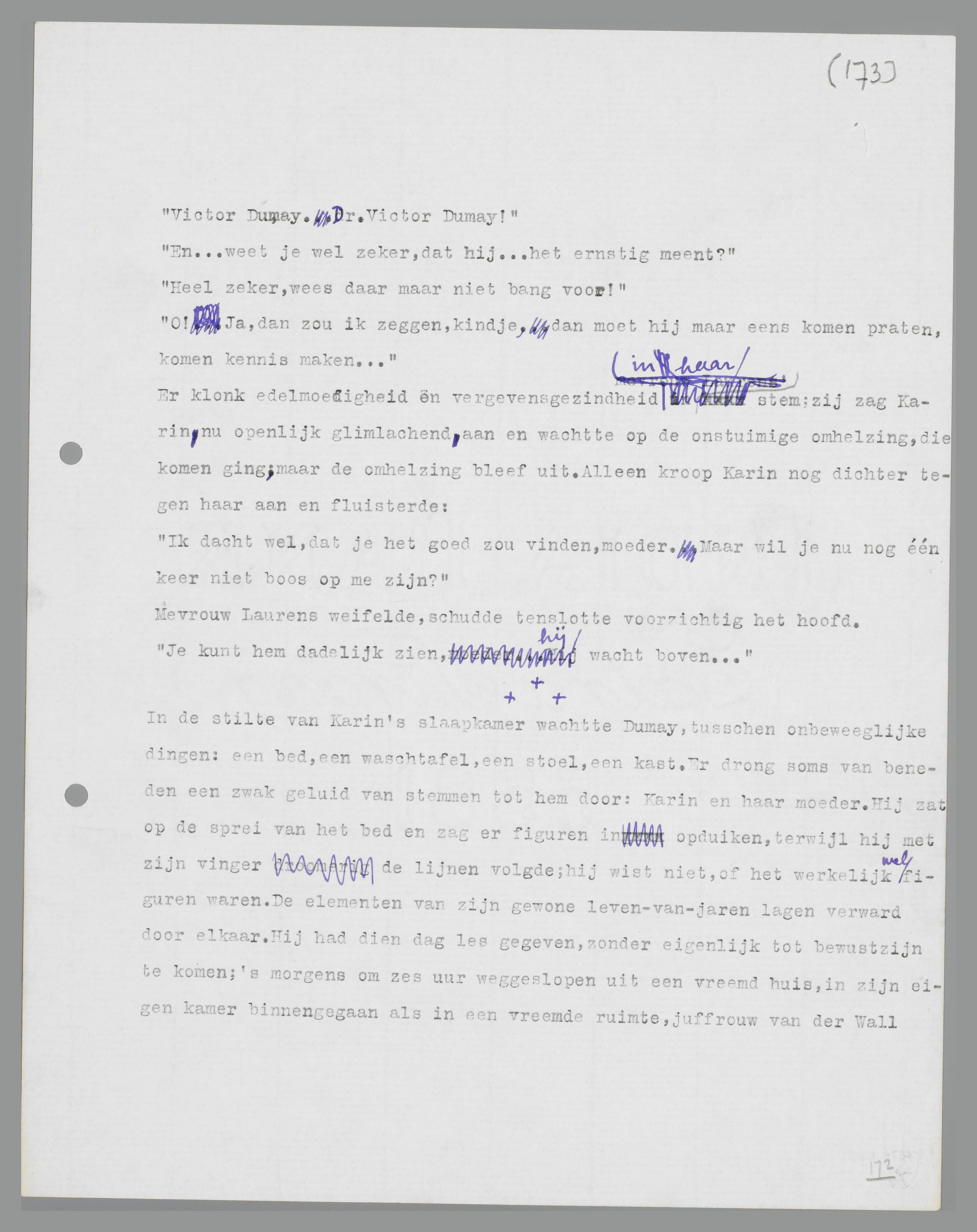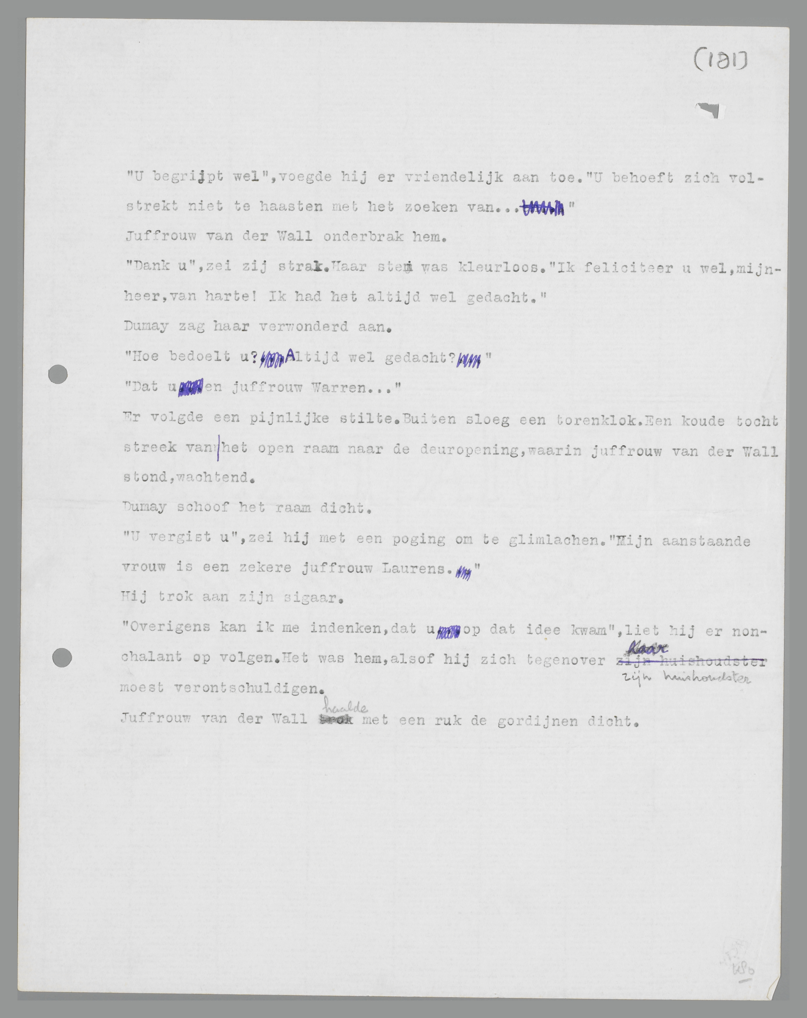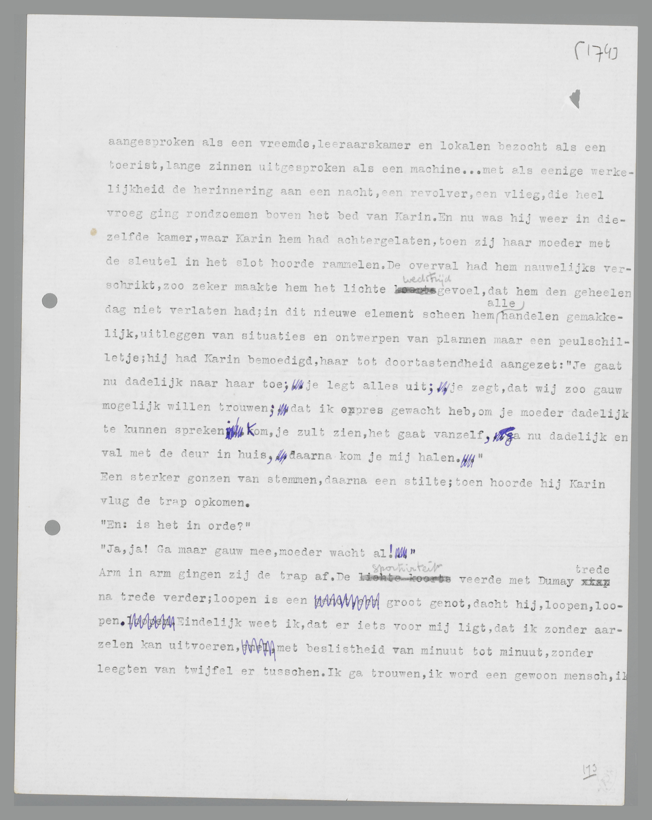 In de stilte van Karins slaapkamer wachtte Dumay, tussen onbeweeglijke dingen: een bed, een wastafel, een stoel, een kast. Er drong soms van beneden een zwak geluid van stemmen tot hem door: Karin en haar moeder. Hij zat op de sprei van het bed en zag er figuren in opduiken, terwijl hij met zijn vinger de lijnen volgde; hij wist niet, of het werkelijk wel figuren waren. De elementen van zijn gewone leven-van-jaren lagen verward door elkaar. Hij had die dag les gegeven, zonder eigenlijk tot bewustzijn te komen; 's morgens om zes uur weggeslopen uit een vreemd huis, in zijn eigen kamer binnengegaan als in een vreemde ruimte, juffrouw Van der Wall aangesproken als een vreemde, leraarskamer en lokalen bezocht als een toerist, lange zinnen uitgesproken als een machine ... met als enige werkelijkheid de herinnering aan een nacht, een revolver, een vlieg, die heel vroeg ging rondzoemen boven het bed van Karin. En nu was hij weer in diezelfde kamer, waar Karin hem had achtergelaten, toen zij haar moeder met de sleutel in het slot hoorde rammelen. De overval had hem nauwelijks verschrikt, zo zeker maakte hem het lichte wedstrijdgevoel, dat hem de gehele dag niet verlaten had; in dit nieuwe element scheen hem alle handelen gemakkelijk, uitleggen van situaties en ontwerpen van plannen maar een peulschilletje; hij had Karin bemoedigd, haar tot doortastendheid aangezet: ‘Je gaat nu dadelijk naar haar toe; je legt alles