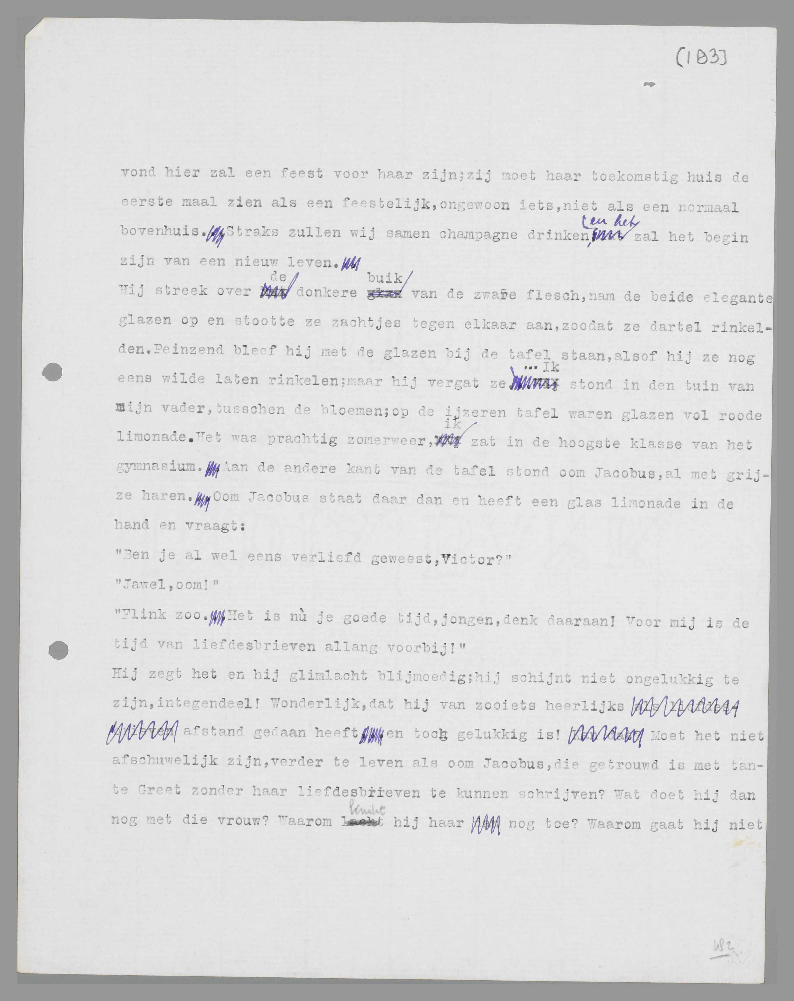 Hij zegt het en hij glimlacht blijmoedig; hij schijnt niet ongelukkig te zijn, integendeel! Wonderlijk, dat hij van zoiets heerlijks afstand gedaan heeft en toch gelukkig is! Moet het niet afschuwelijk zijn, verder te leven als oom Jacobus, die getrouwd is met tante Greet zonder haar liefdesbrieven te kunnen schrijven? Wat doet hij dan nog met die vrouw? Waarom knikt hij haar nog toe? Waarom gaat hij niet weg, overal liever heen dan naar het dikke mens, dat zijn vrouw is, en dat om een liefdesbrief van haar man alleen maar zou kunnen lachen? Is het niet jammerlijk, dat het hele leven op zulke ellende uitloopt? Dat zal mij niet overkomen, nooit!
