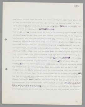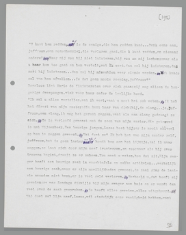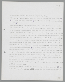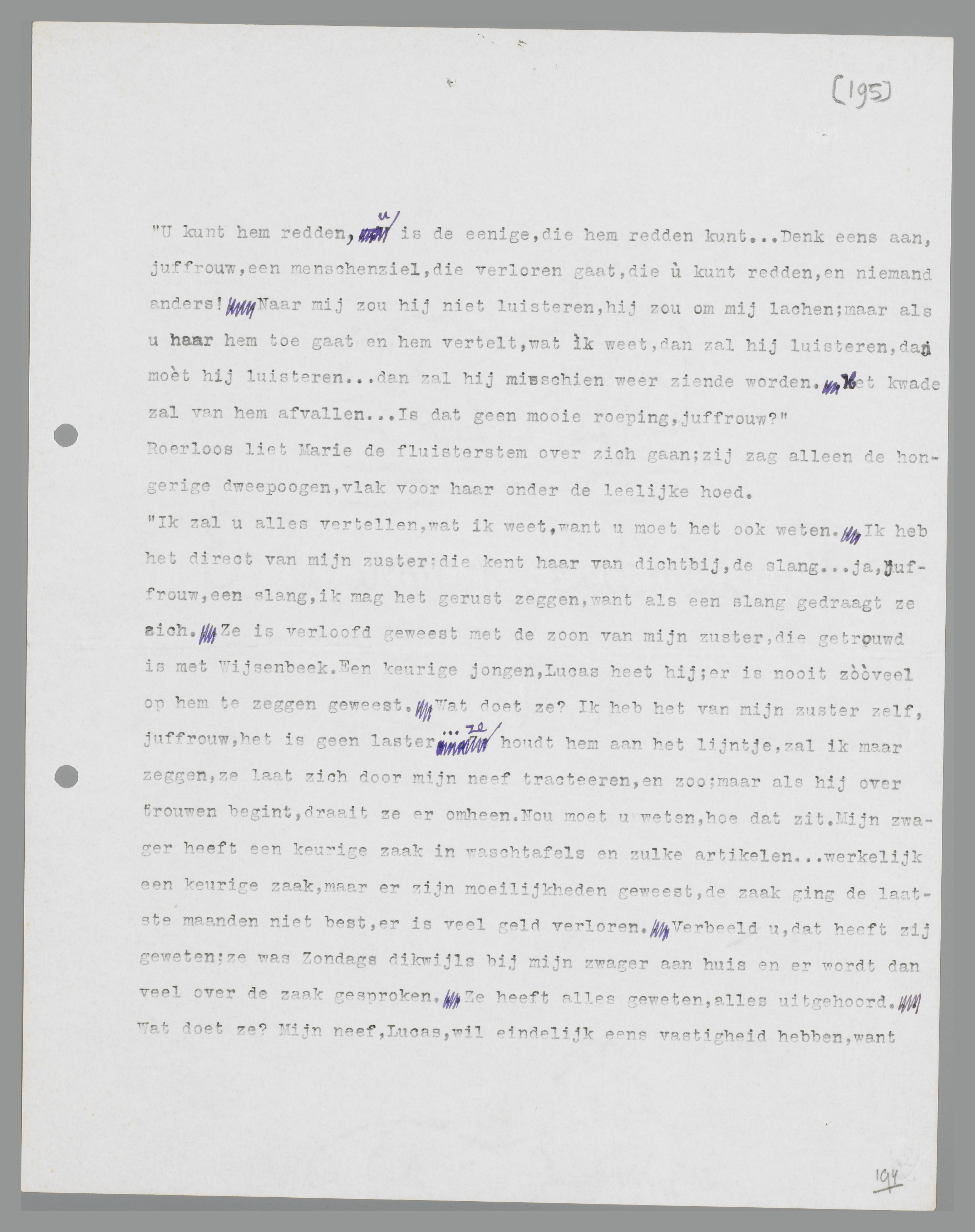 ‘Ik zal u alles vertellen, wat ik weet. Ik heb het direct van mijn zuster; die kent haar van dichtbij, de slang ... ja, juffrouw, een slang, ik mag het gerust zeggen, want als een slang gedraagt ze zich. Ze is verloofd geweest met de zoon van mijn zuster, die getrouwd is met Wijsenbeek. Een keurige jongen, Lucas heet hij; er is nooit zóveel op hem te zeggen geweest. Wat doet ze? Ik heb het van mijn zuster zelf, juffrouw, het is geen laster ... ze houdt hem aan het lijntje, zal ik maar zeggen, ze laat zich door mijn neef tracteren, en zo; maar als hij over trouwen begint, draait ze er omheen. Nou moet u weten, hoe dat zit. Mijn zwager heeft een keurige zaak in wastafels en zulke artikelen ... werkelijk een keurige zaak, maar er zijn moeilijkheden geweest, de zaak ging de laatste maanden niet best, er is veel geld verloren. Verbeeld u, dat heeft zij geweten; ze was Zondags dikwijls bij mijn zwager aan huis en er wordt dan veel over de zaak gesproken. Ze heeft alles geweten, alles uitgehoord. Wat doet ze? Mijn neef, Lucas, wil eindelijk eens vastigheid hebben, want lang verloofd zijn, daar had hij het niet op, dat begrijpt u ook wel, juffrouw. ... Ik zal u vertellen, hij is rechtuit, hij vraagt haar recht in haar gezicht, wanneer ze met hem wil trouwen. En zij? De hele dag, zeg ik u, de hele dag heeft ze nog bij mijn zwager en mijn zuster gezeten, alsof alles in orde is ... en 's avonds zegt ze tegen mijn neef, met een