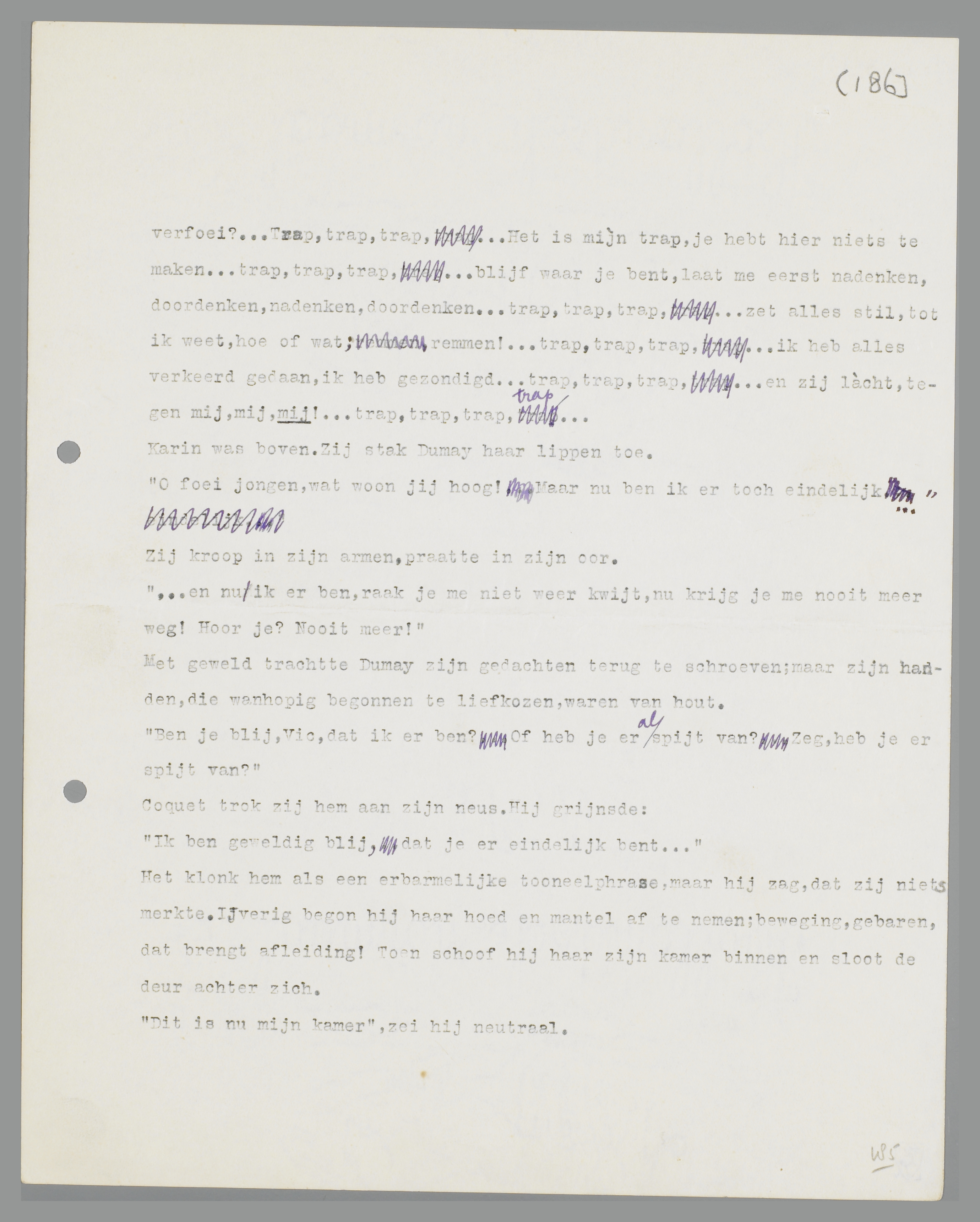 Hij zag Karin lachend de trap op komen. Waarom lacht ze, tegen mij, die haar verfoeit? ... Trap, trap, trap. ... Het is mìjn trap, je hebt hier niets te maken ... trap, trap, trap ... blijf waar je bent, laat me eerst nadenken, doordenken, nadenken, doordenken ... trap, trap, trap ... zet alles stil, tot ik weet, hoe of wat; remmen! ... trap, trap, trap ... ik heb alles verkeerd gedaan, ik heb gezondigd ... trap, trap, trap ... en zij làcht, tegen mij, mij mij! ... trap, trap, trap, trap. ...