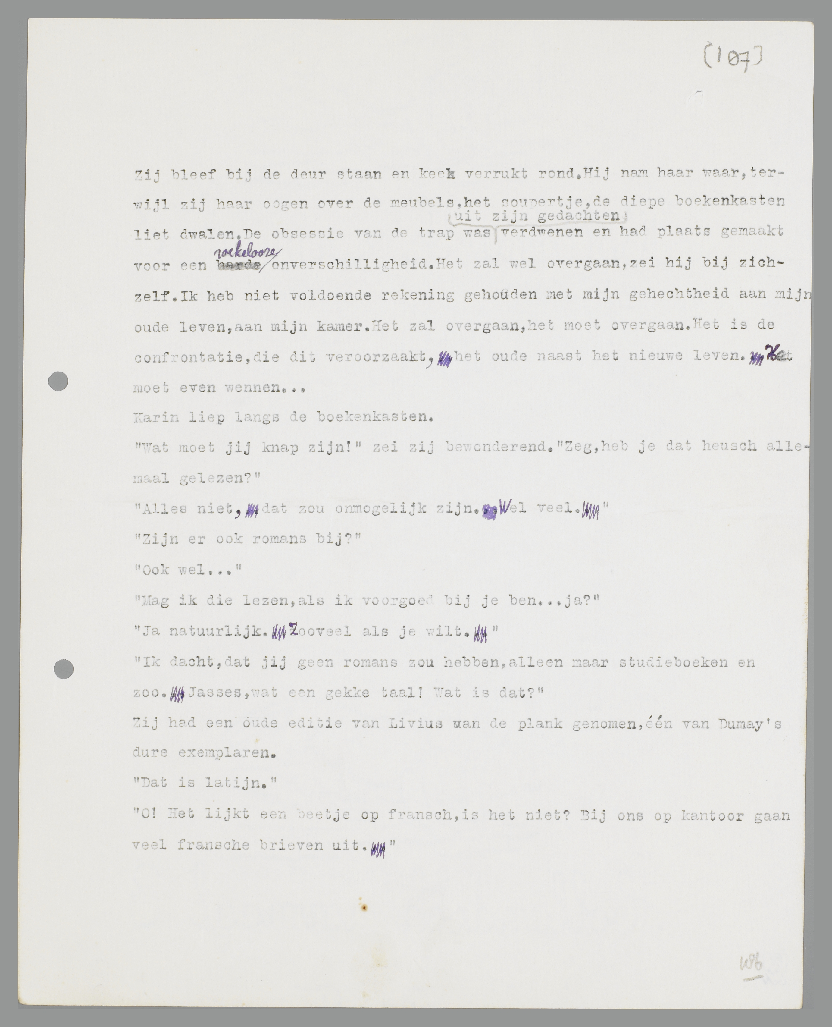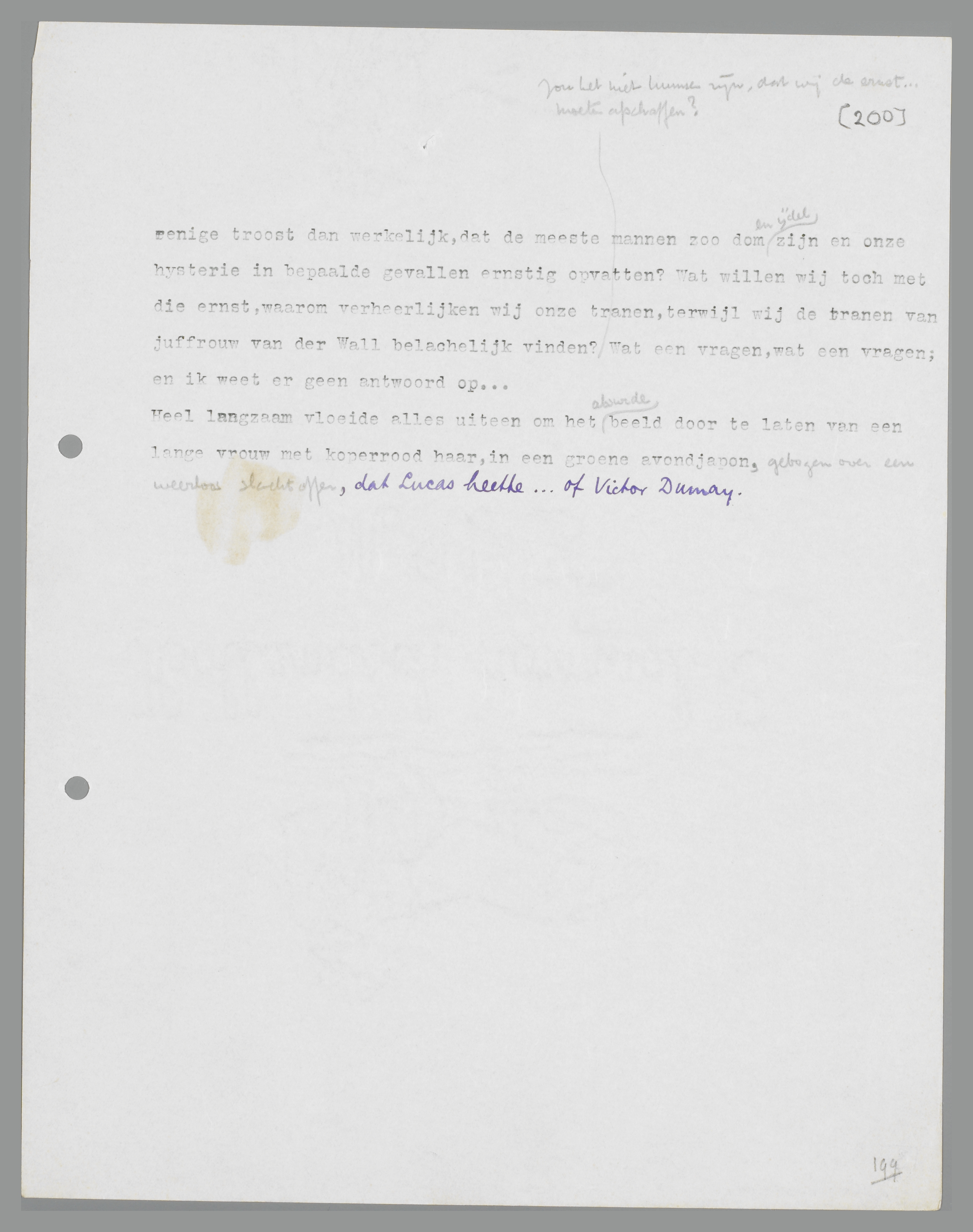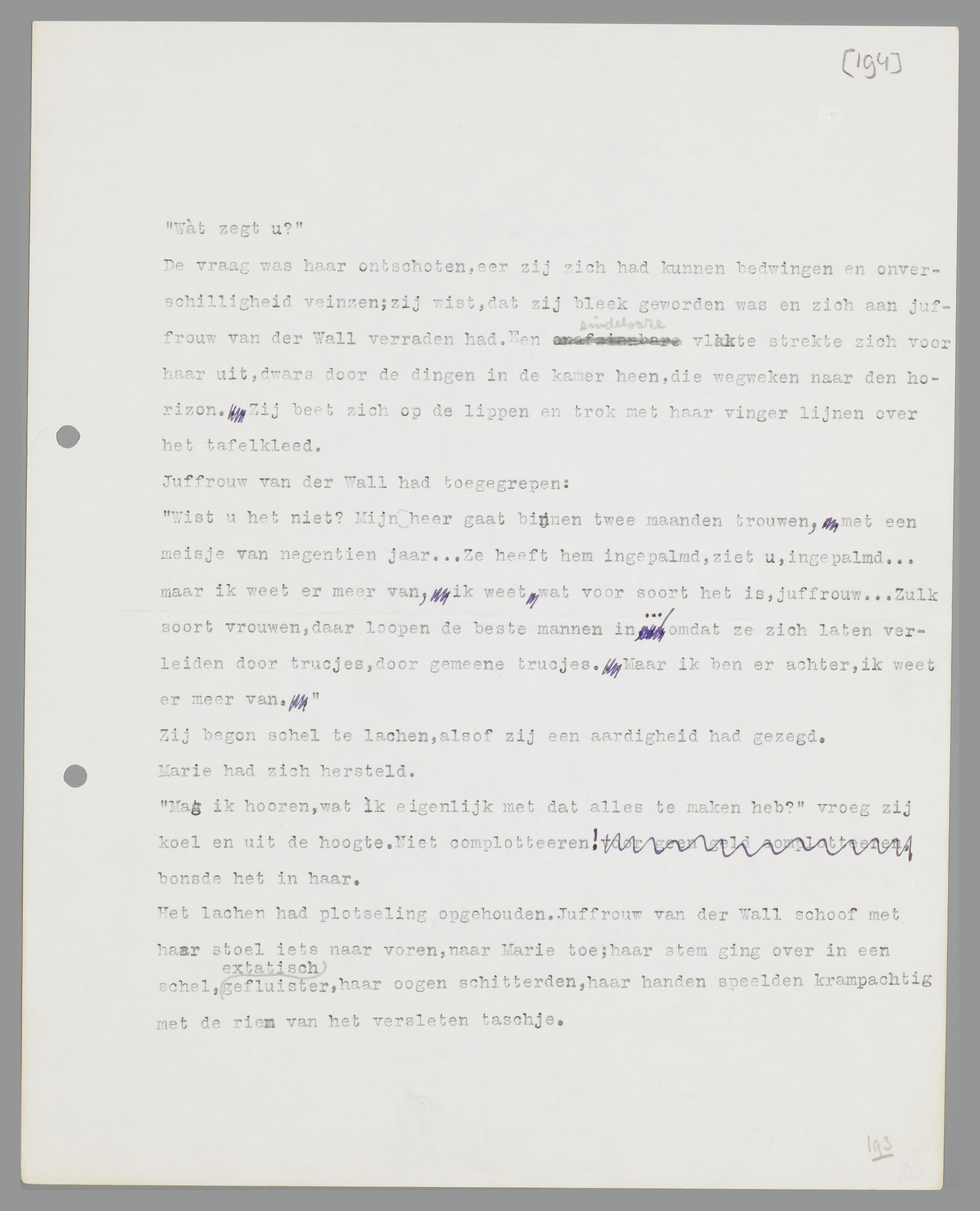 Door het raam van haar kamer zag zij juffrouw Van der Wall in de al half duistere straat verdwijnen. Wat moet zij die vrouw haten, dacht zij, slap tegen het raamkozijn leunend, dat zij naar mij toegekomen is, naar mij, die zij altijd gehaat heeft. Mijn God: en dat zijn nu wij vrouwen! Wij: juffrouw Van der Wall, die andere, en ik, ja, ik ook! Ik kan mij niet uitzonderen, ik wìl mij niet eens uitzonderen. ‘Alle normale vrouwen willen trouwen, en als ze niet trouwen, worden ze hysterisch.’ George's verbitterde uitspraak kwam haar weer voor de geest; zij hoorde weer zijn geladen stem, zij zag zijn verzekerd en teleurgesteld gezicht, en één voor één liet zij de vrouwen, die zij gekend had, aan zich voorbijtrekken, met him liefden en hun vijandschappen, met hun vroomheidsbevliegingen en hun strovuur-passies voor academische studie of ziekenverpleging; de vrouwen, onherkenbaar dik en tevreden geworden na een jaar huwelijk met een willekeurige man; en de vrije vrouwen, de schrijvende en de verzuurde, en de actrices, en de compromis-vrouwen. ... Heeft hij dan toch gelijk, die domme George, moet onze erfzonde dan werkelijk zo en niet anders heten: hysterie? En ontkomt mìjn soort alleen langer aan dat woord door zich ‘gevoelig’ te laten noemen? Moet ik er misschien trots op zijn, dat ik weinig vriendinnen heb gehad, en dan alleen nog in het voorbijgaan? Is onze enige troost dan werkelijk, dat de meeste mannen zo dom en ijdel zijn en onze hysterie in bepaalde gevallen ernstig opvatten? Wat willen wij toch met die ernst, waarom verheerlijken wij onze tranen, terwijl wij de tranen van juffrouw Van der Wall belachelijk vinden? Zou het niet kunnen zijn, dat wij de ernst ... moeten afschaffen? Wat een vragen, wat een vragen; en ik weet er geen antwoord op. ...