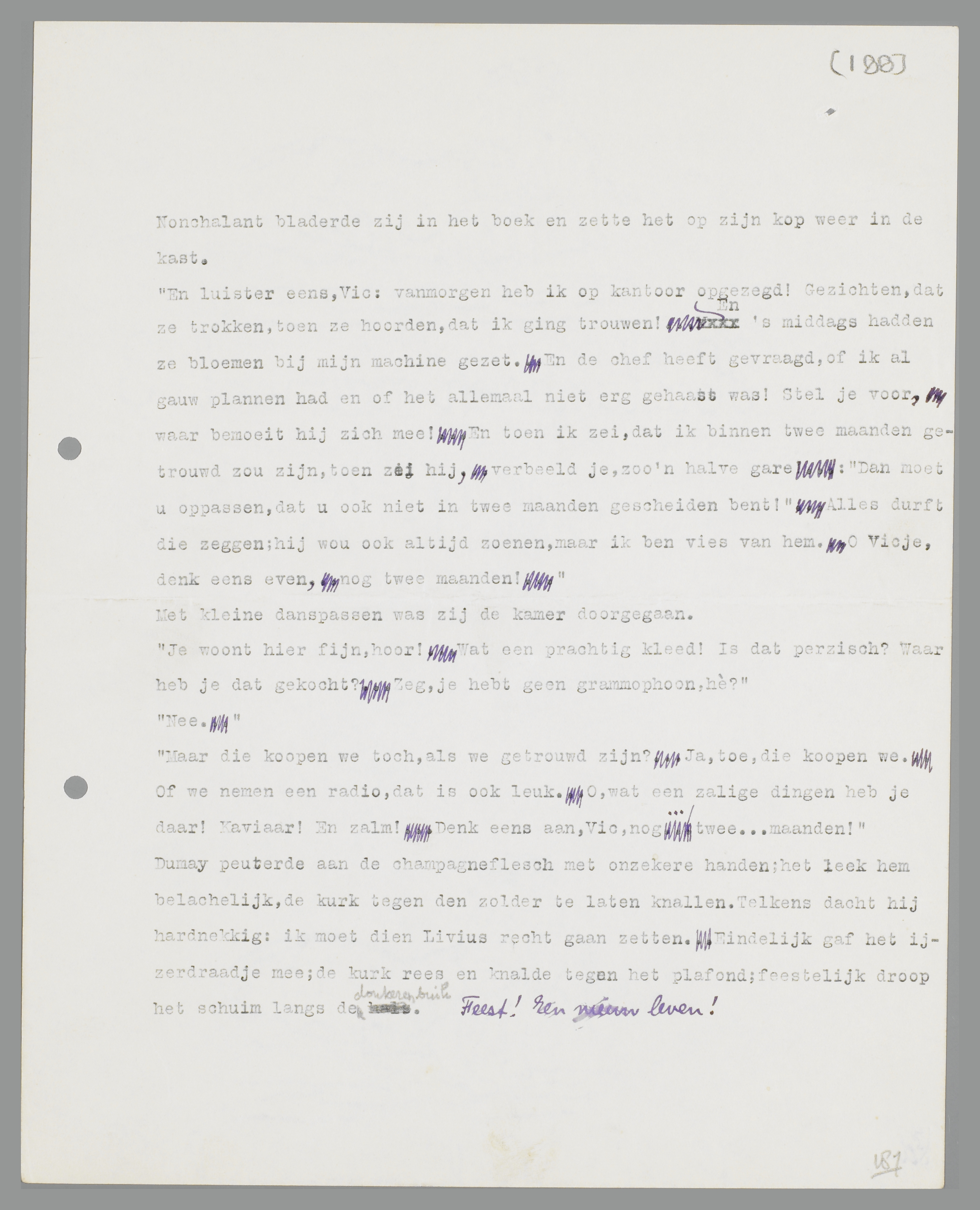 Dumay peuterde aan de champagnefles met onzekere handen; het leek hem belachelijk, de kurk tegen de zolder te laten knallen. Telkens dacht hij hardnekkig: ik moet die Livius recht gaan zetten. Eindelijk gaf het ijzerdraadje mee; de kurk rees en knalde tegen het plafond; feestelijk droop het schuim langs de donkere buik. Feest! Een nieuw leven!