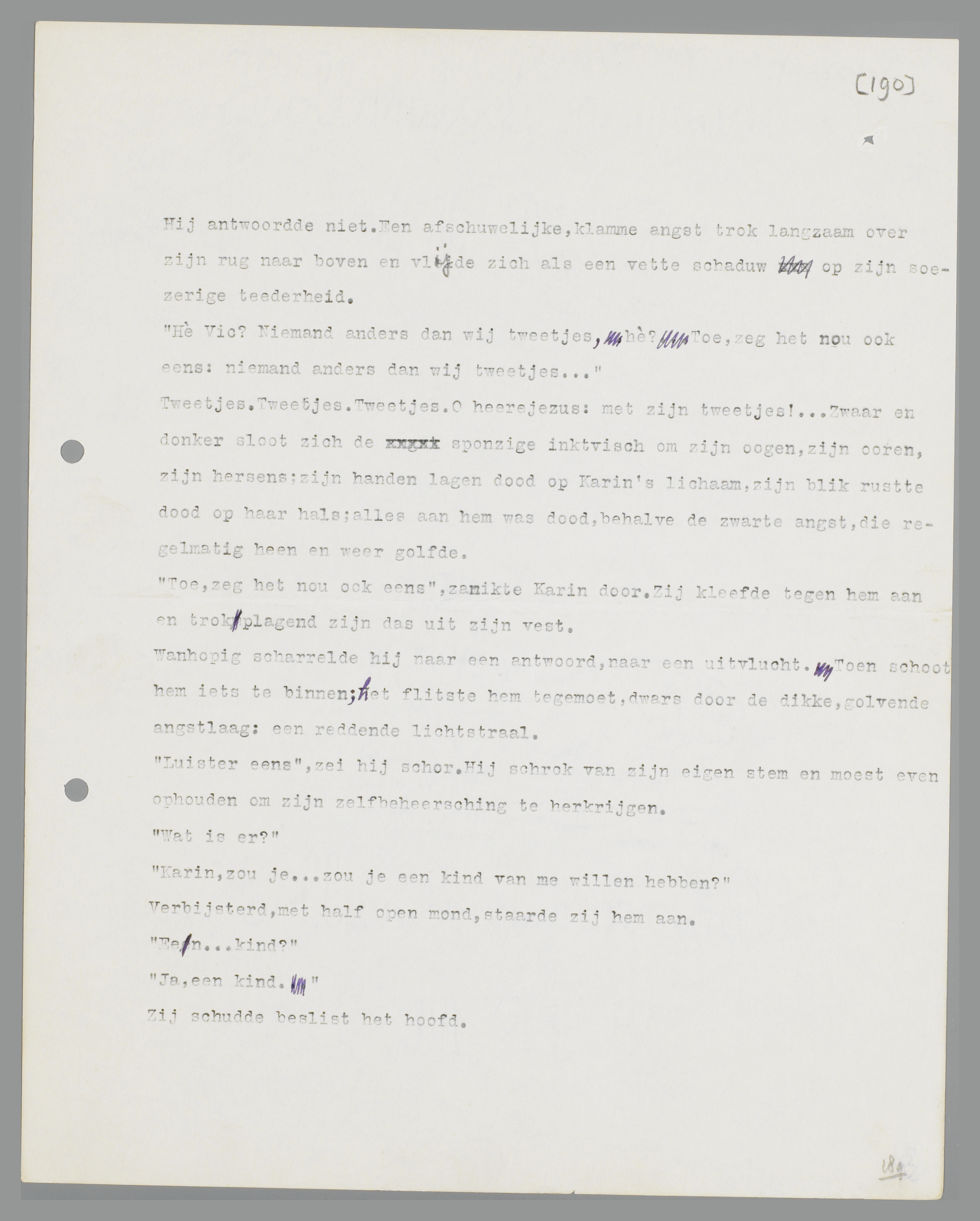 Tweetjes. Tweetjes. Tweetjes. O herejezus: met zijn tweetjes! ... Zwaar en donker sloot zich de sponzige inktvis om zijn ogen, zijn oren, zijn hersens; zijn handen lagen dood op Karins lichaam, zijn blik rustte dood op haar hals; alles aan hem was dood, behalve de zwarte angst, die regelmatig heen en weer golfde.