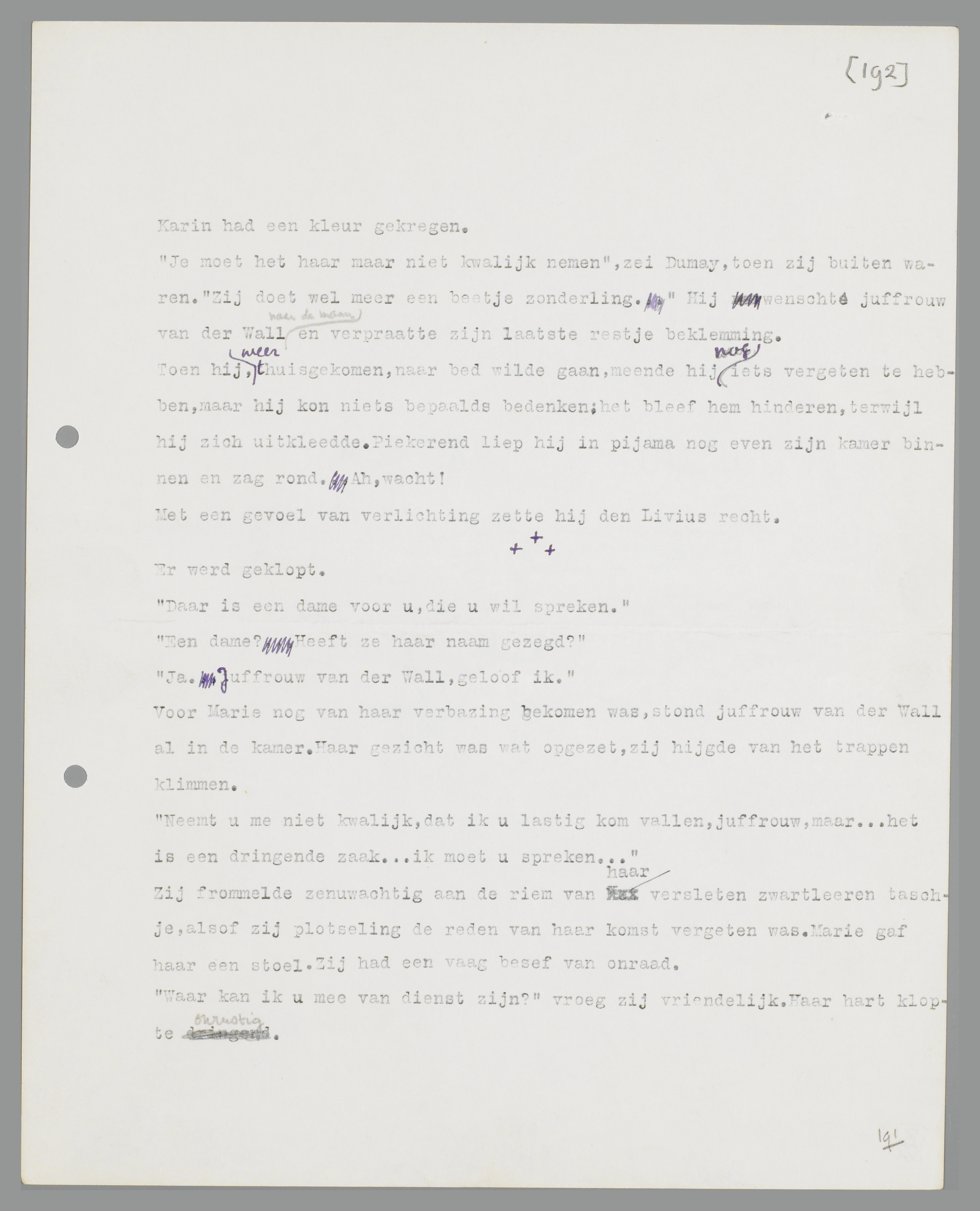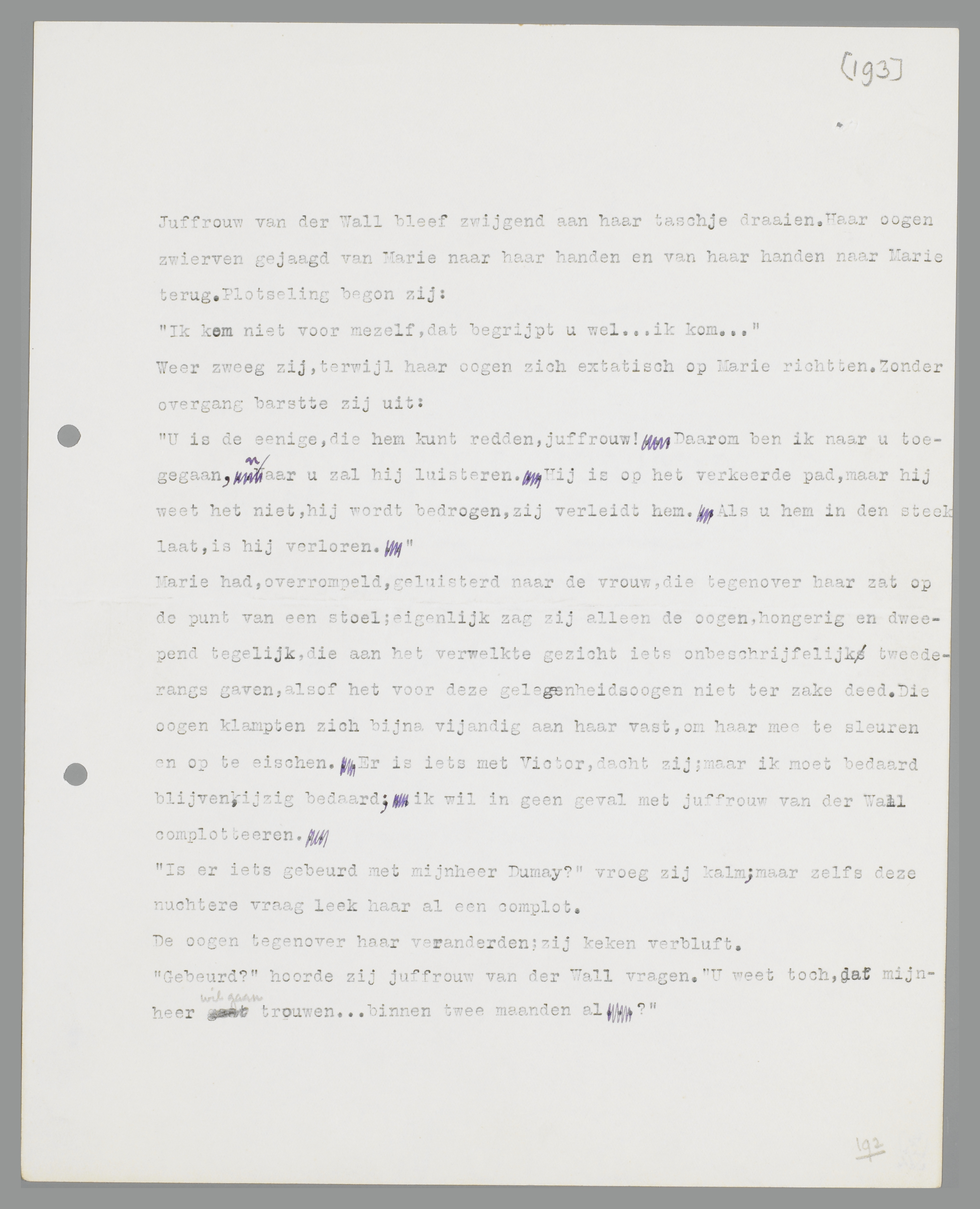 Juffrouw Van der Wall bleef zwijgend aan haar tasje draaien. Haar ogen zwierven gejaagd van Marie naar haar handen en van haar handen naar Marie terug. Plotseling begon zij: