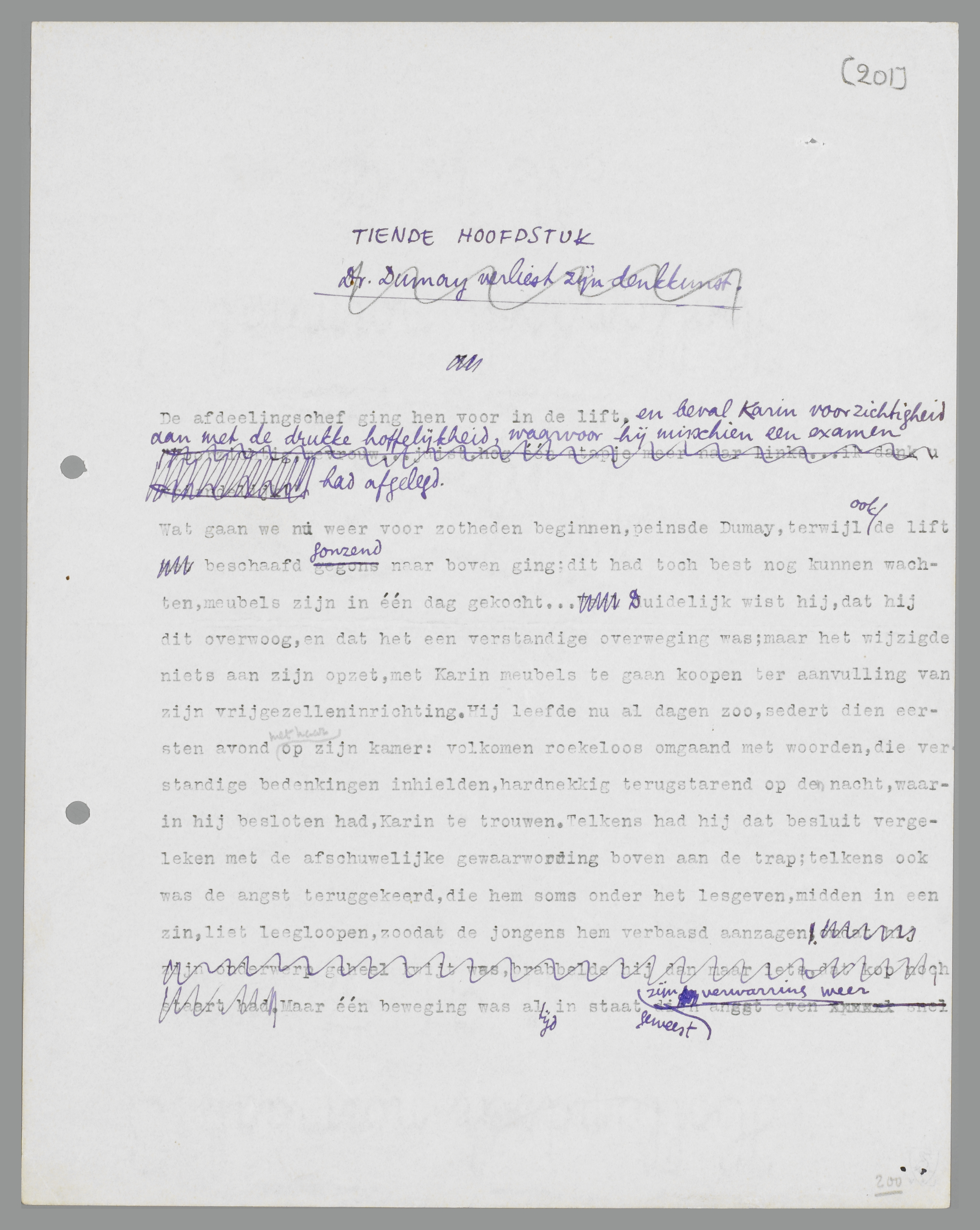 Wat gaan we nu weer voor zotheden beginnen, peinsde Dumay, terwijl ook de lift beschaafd gonzend naar boven ging; dit had toch best nog kunnen wachten, meubels zijn in één dag gekocht. ... Duidelijk wist hij, dat hij dit overwoog, en dat het een verstandige overweging was; maar het wijzigde niets aan zijn opzet, met Karin meubels te gaan kopen ter aanvulling van zijn vrijgezelleninrichting. Hij leefde nu al dagen zo, sedert die eexste avond met haar op zijn kamer: volkomen roekeloos omgaand met woorden, die verstandige bedenkingen inhielden, hardnekkig terugstarend op de nacht, waarin hij besloten had, Karin te trouwen. Telkens had hij dat besluit vergeleken met de afschuwelijke gewaarwording boven aan de trap; telkens ook was de angst teruggekeerd, die hem soms onder het lesgeven, midden in een zin, liet leeglopen, zodat de jongens hem verbaasd aanzagen. Maar één beweging was altijd in staat geweest zijn verwarring weer te doen verdwijnen; hij vertaalde een passage voor, sloeg een bladzijde om ... en dezelfde feiten lagen om hem heen, in dezelfde verhoudingen, maar zonder de angst! De feiten gaven hem dan luchthartige wenken, terwijl zij hem een ogenblik geleden ondraaglijk waren voorgekomen: zie je wel, we zijn niet zo kwaad, je hoeft ons niet te overschatten, je moet je niet door de eerste de beste ervaring laten afschrikken van iets, waarover je zonder weekheid hebt nagedacht, waarvan je nuchter het voor en tegen hebt overwogen. Kom kom, jonge man, ex zijn ergere dingen, hongersnoden, werkstakingen, oorlogen; over dit probleempje hoef je waarachtig niet zo lang te tobben! Je wilde een vrouw zonder culturele aanstelle-