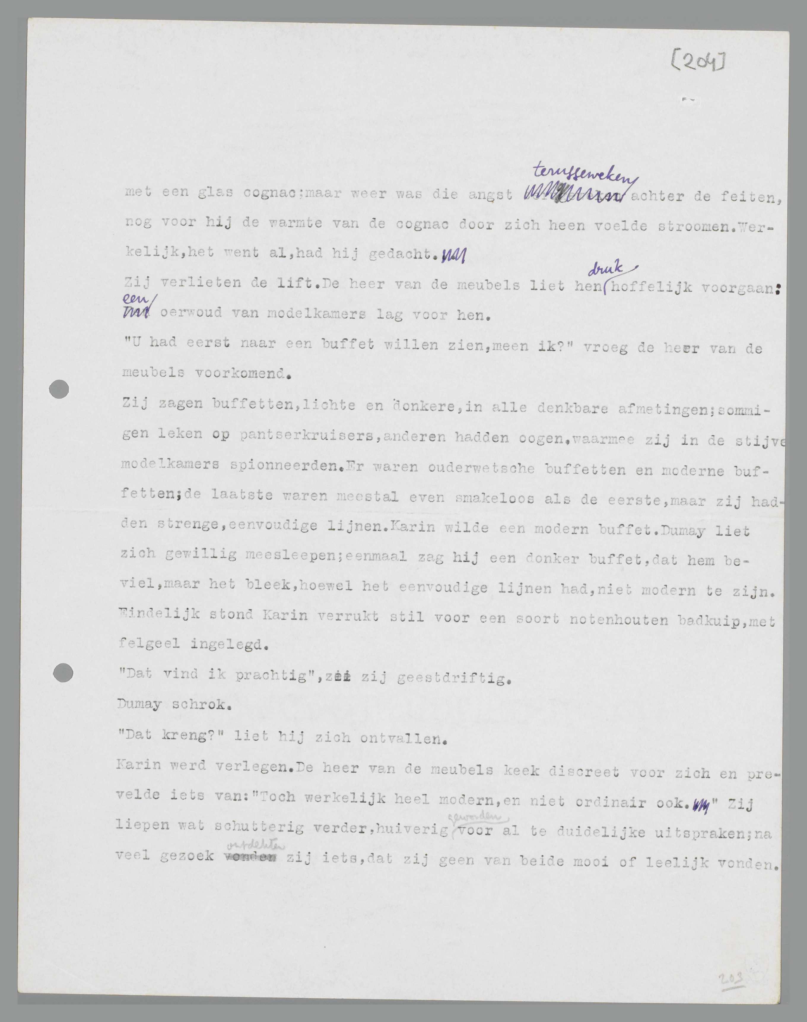 ‘Och mevrouw, er zijn altijd mensen, die een fietsstuur mooier vinden dan een schilderij,’ zei de heer grappig; hij durfde zich dat wel veroorloven, nu hij de geringschatting in Karins ogen las; ‘maar modern is het wel, het is iets nieuws, ziet u, en ik heb ook heel goede klanten, die al naar worden als ze hout zien, mevrouw, werkelijk waar, die zijn er, ik zou u de adressen hier in de stad kunnen opgeven. Het is iets nieuws,’ herhaalde hij nog eens, alsof hij zijn verhouding tot de stalen meubelen daardoor verduidelijkte.