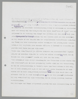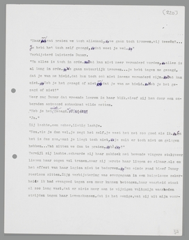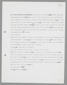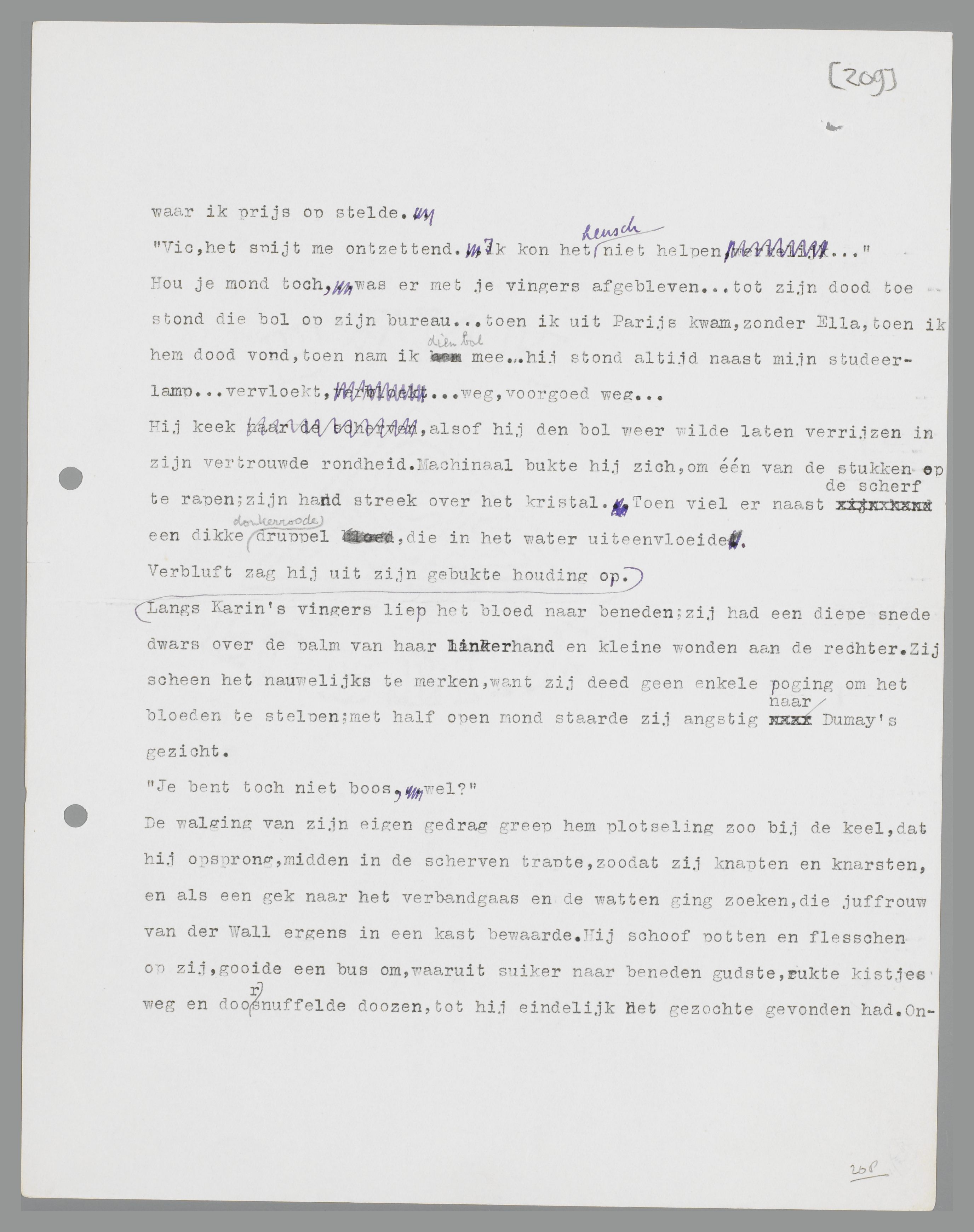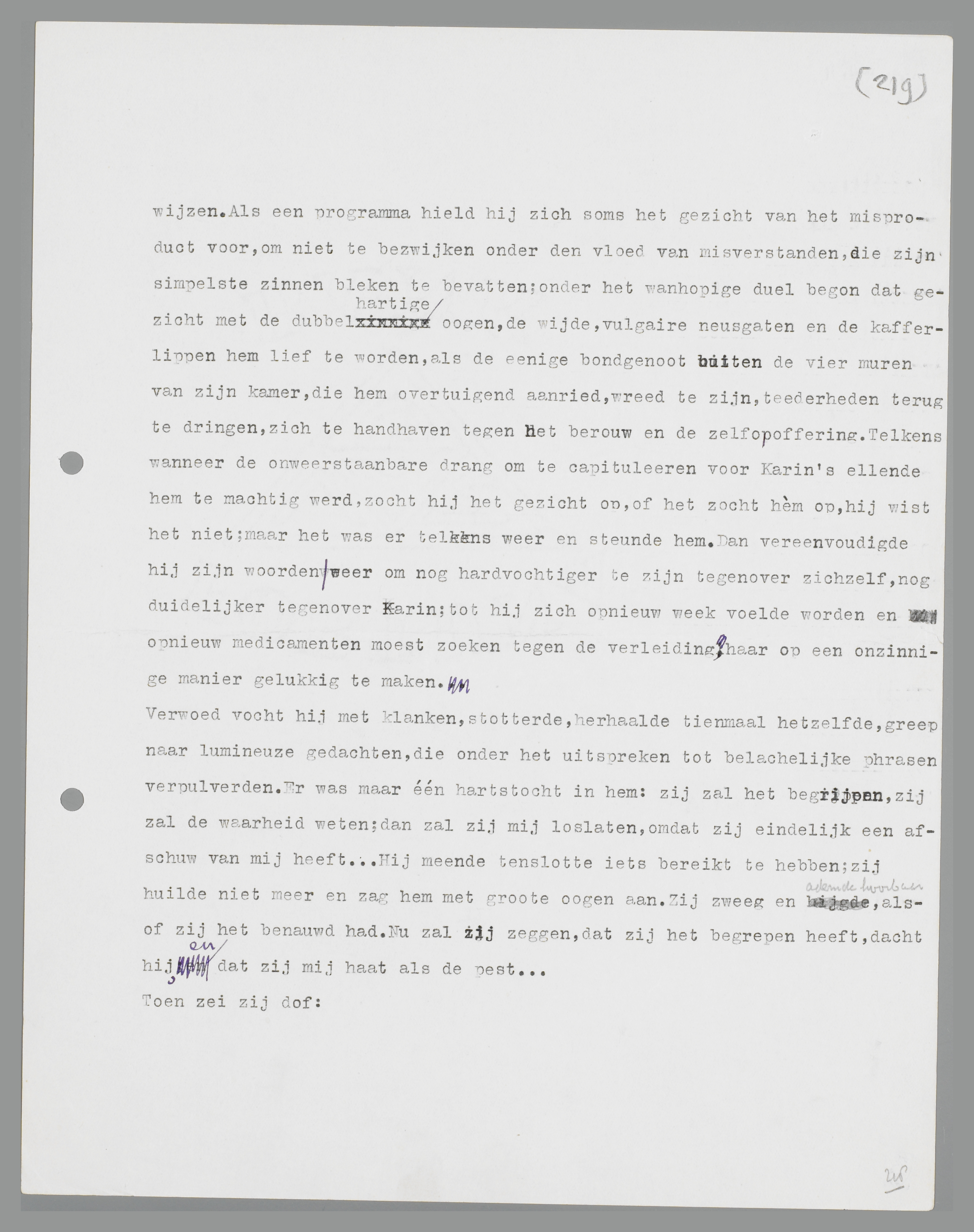 ... ik heb op de bodem gezien, nu pas. Nu pas, hoe is het mogelijk? moet een glazen bol in scherven vallen, om iemand wetend te maken? Een stuk dood kristal is mij dierbaarder dan Karin. Het spel is verloren, hoe ben ik het ooit begonnen! op déze manier! en hoe moet dit aflopen? ... Als ik maar alleen was. ...