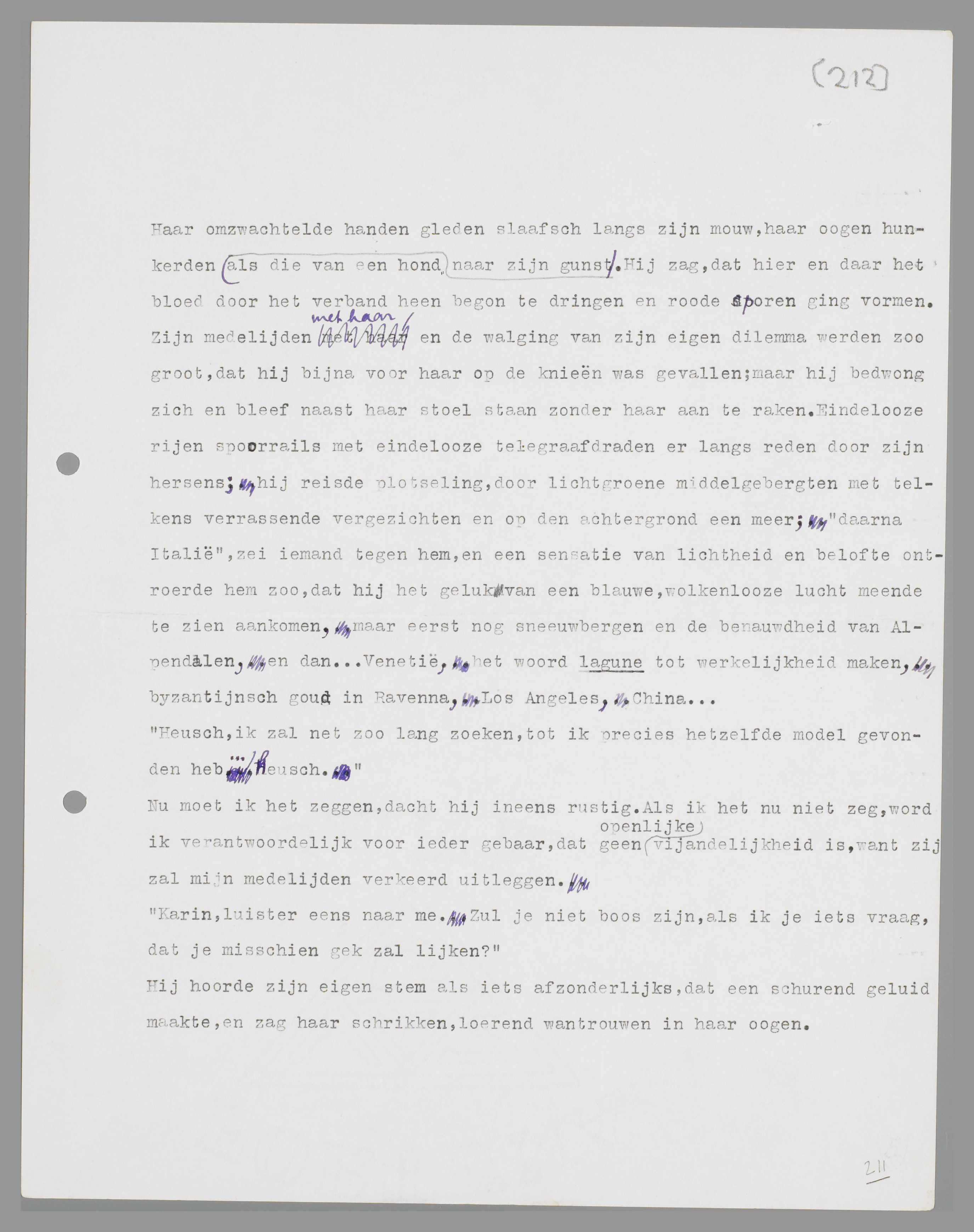 Haar omzwachtelde handen gleden slaafs langs zijn mouw, haar ogen hunkerden naar zijn gunst als die van een hond. Hij zag, dat hier en daar het bloed door het verband heen begon te dringen en rode sporen ging vormen. Zijn medelijden met haar en de walging van zijn eigen dilemma werden zo groot, dat hij bijna voor haar op de knieën was gevallen; maar hij bedwong zich en bleef naast haar stoel staan zonder haar aan te raken. Eindeloze rijen spoorrails met eindeloze telegraafdraden er langs reden door zijn hersens; hij reisde plotseling, door lichtgroene middelgebergten met telkens verrassende vergezichten en op de achtergrond een meer; ‘daarna Italië’, zei iemand tegen hem, en een sensatie van lichtheid en belofte ontroerde hem zo, dat hij het geluk van een blauwe, wolkenloze lucht meende te zien aankomen; maar eerst nog sneeuwbergen en de benauwdheid van Alpendalen, en dan ...