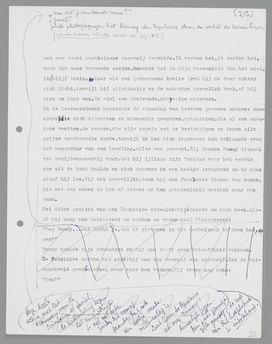 stilte kwam. De les begon; een fragment uit de Germania werd opgedreund. Langzaam zonk Dumay weer weg in de nachtmerries, die hem gevangen hidden; hij liet fouten passeren, vergat verder te gaan, als er een beurt voorbij was, en drukte zo hard op een stuk krijt, dat het doormidden knapte; met een vloek smeet hij het in de papiermand.