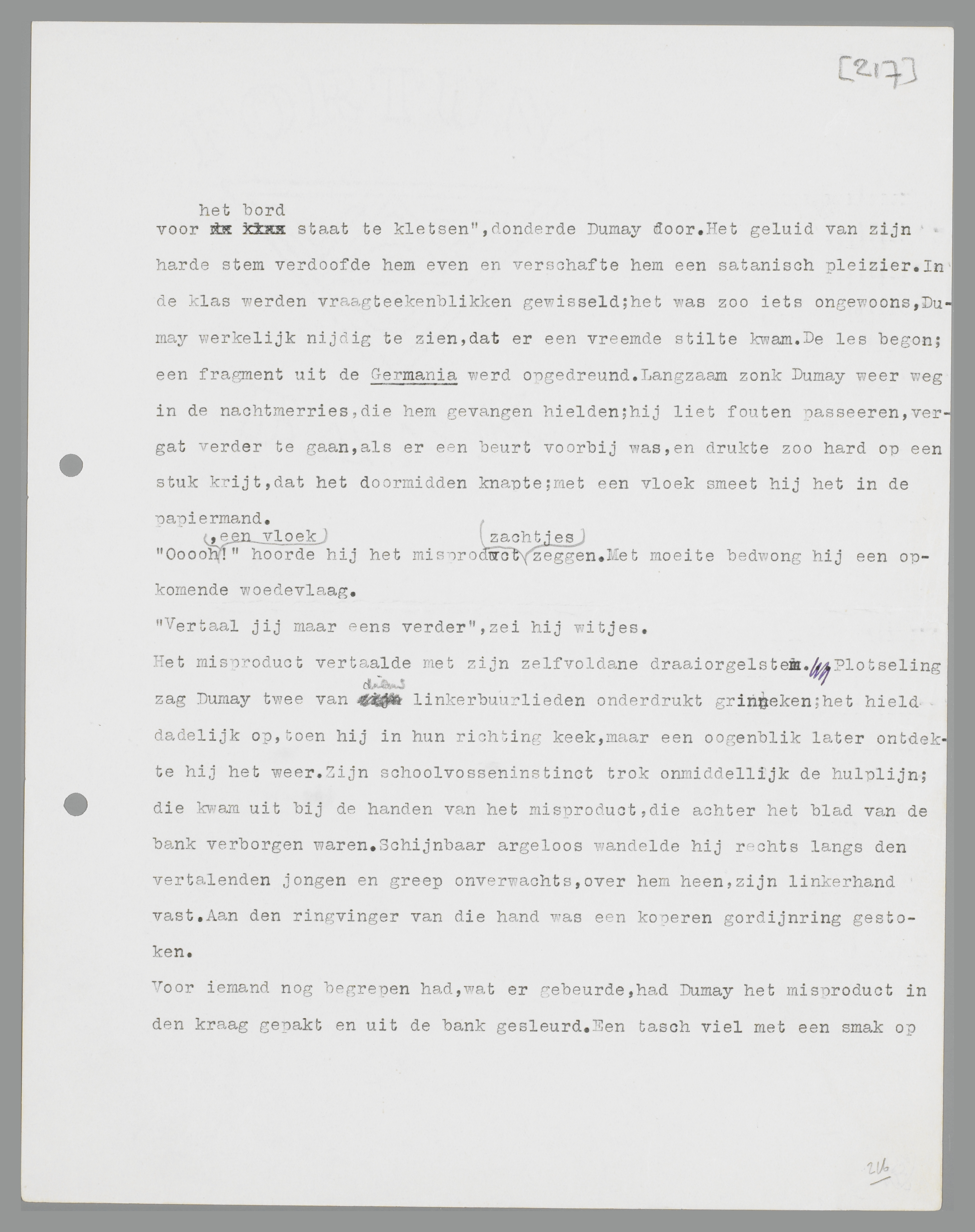 Het misproduct vertaalde met zijn zelfvoldane draaiorgelstem. Plotseling zag Dumay twee van diens linkerbuurlieden onderdrukt grinniken; het hield dadelijk op, toen hij in hun richting keek, maar een ogenblik later ontdekte hij het weer. Zijn schoolvosseninstinct trok onmiddellijk de hulplijn; die kwam uit bij de handen van het misproduct, die achter het blad van de bank verborgen waren. Schijnbaar argeloos wandelde hij rechts langs de vertalende jongen en greep onverwachts, over hem heen, zijn linkerhand vast. Aan de ringvinger van die hand was een koperen gordijnring gestoken.