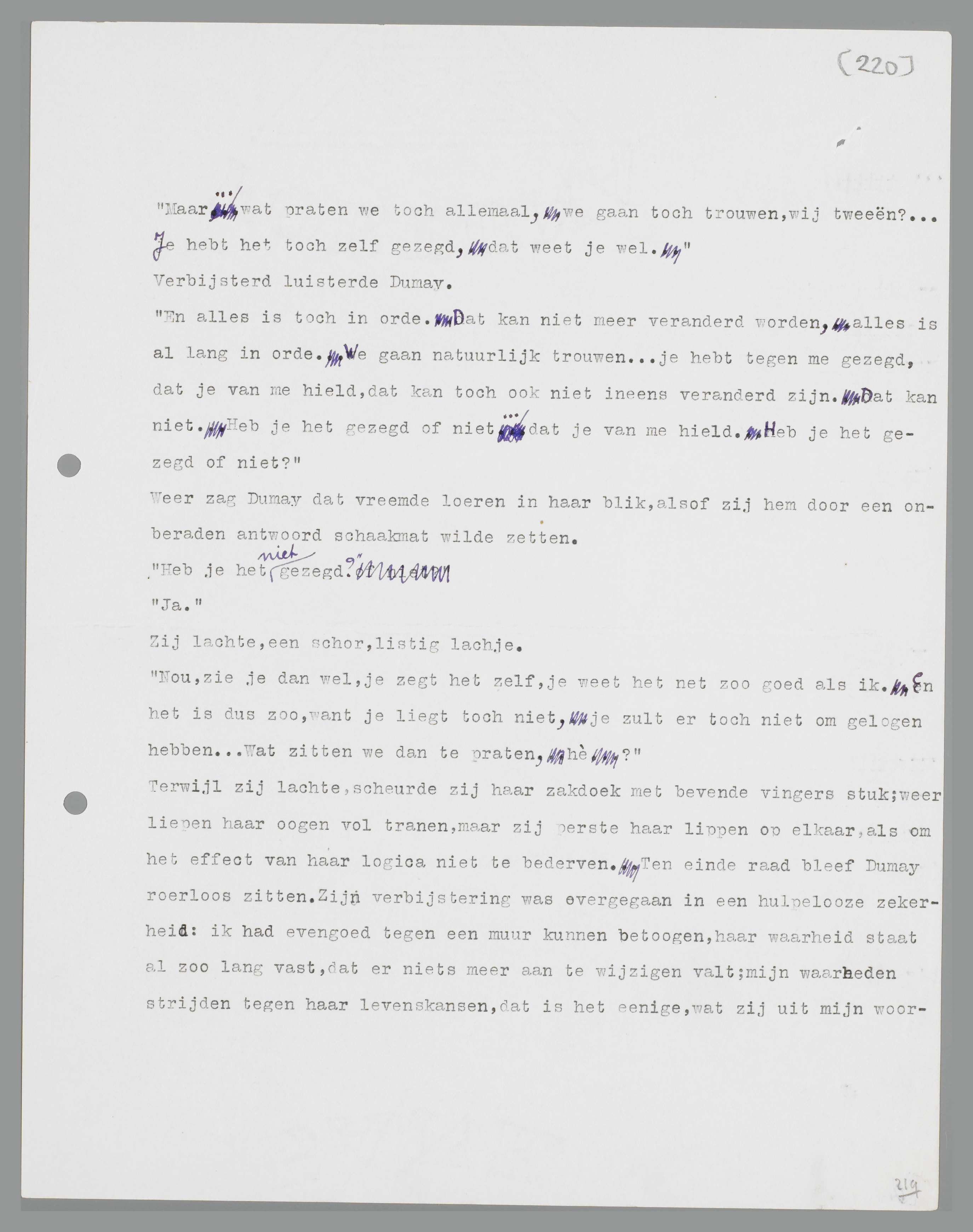 Terwijl zij lachte, scheurde zij haar zakdoek met bevende vingers stuk; weer liepen haar ogen vol tranen, maar zij perste haar lippen op elkaar, als om het effect van haar logica niet te bederven. Ten einde raad bleef Dumay roerloos zitten. Zijn verbijstering was overgegaan in een hulpeloze zekerheid: ik had evengoed tegen een muur kunnen betogen, haar waarheid staat al zo lang vast, dat er niets meer aan te wijzigen valt; mijn waarheden strijden tegen haar levenskansen, dat is het enige, wat zij uit mijn woorden heeft overgehouden! Op dat ogenblik haatte hij haar, zoals zij daar zat, met haar betraande ogen en haar handen met pleisters, die de zakdoek langzaam stukscheurden; hij haatte haar om de domme sluwheid van haar redenering, die zijn eerlijkheid niet méér telde dan oplichtersargumenten. Hij haatte haar zo, dat hij zijn medelijden vergat. Eén ogenblik; toen keerde zijn haat zich