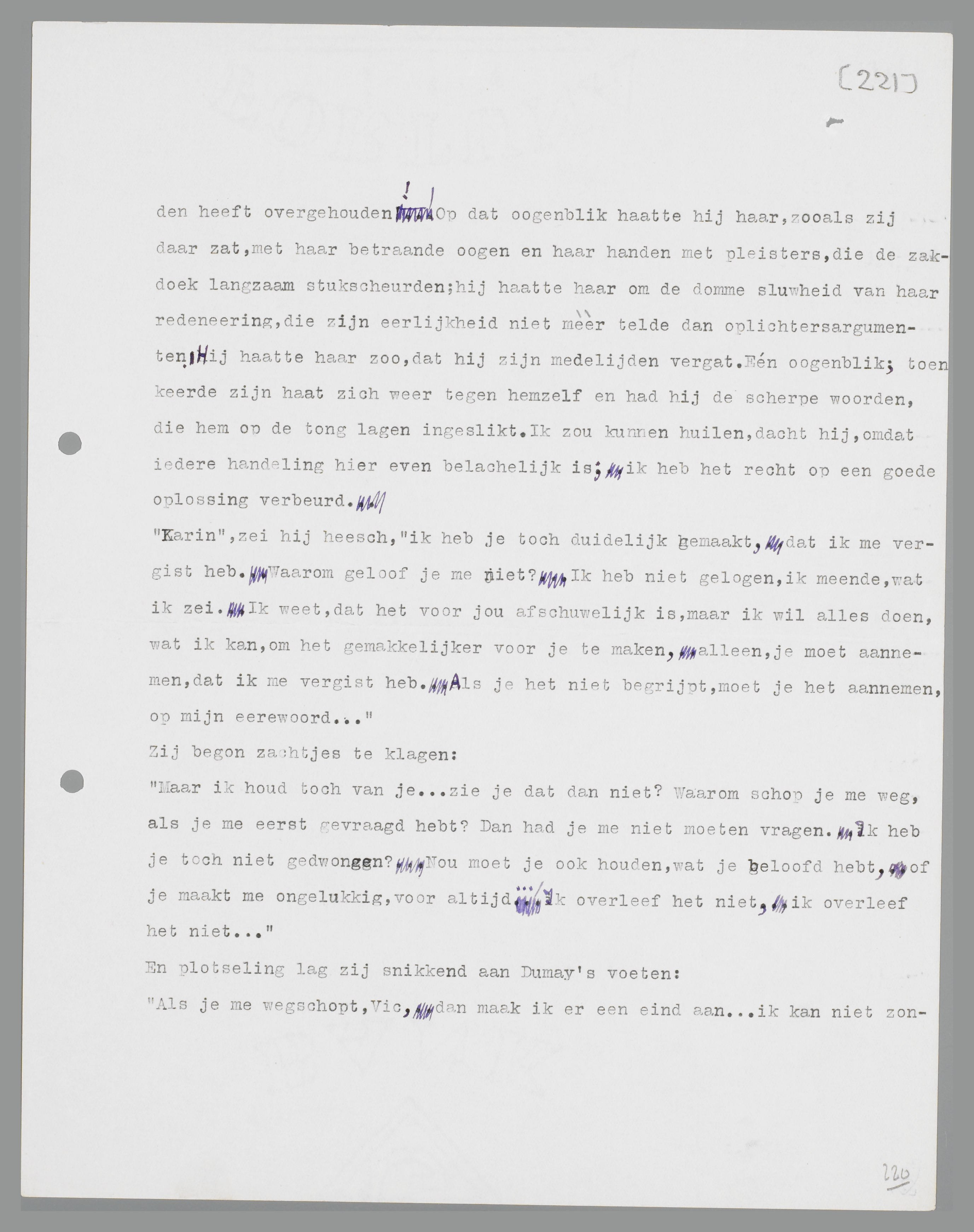 Toen Karin die avond bij hem kwam, was het het groenbleke gezicht van het misproduct, dat hem leidde, hem hard en wreed maakte bij de biecht, waaraan geen ontkomen was. Met de domste, onhandigste woorden klaagde hij zichzelf aan; de eenvoudigste beelden zocht hij op, om zich verstaanbaar te maken; hij bespotte zichzelf door de gebeurtenissen, die hij nu als groteske avonturen achter zich zag liggen, nog eenmaal met tragische ernst tegen zich aan te voeren. Voor het eerst in zijn leven besefte hij, wat het was, waar te moeten zijn om zich te kunnen rechtvaardigen tegenover een tweede; alle paraderen met termen, alle gemakkelijke verstaanbaarheid tussen gelijkgezinden liet hem hier in de steek; de woorden dienden zich niet welwillend aan, zij kwamen als gedrochtelijke misbaksels ter wereld, om in een volgend ogenblik hun jammerlijke ontoereikendheid jammerlijk te bewijzen. Als een programma hield hij zich soms het gezicht van het misproduct voor, om niet te bezwijken onder de vloed van misverstanden, die zijn simpelste zinnen bleken te bevatten; onder het wanhopige duel begon dat gezicht met de dubbelhartige ogen, de wijde, vulgaire neusgaten en de kafferlippen hem lief te worden, als de enige bondgenoot buiten de vier muren van zijn kamer, die hem overtuigend aanried, wreed te zijn, tederheden terug te dringen, zich te handhaven tegen het berouw en de zelfopoffering. Telkens wanneer de onweerstaanbare drang om te capituleren voor Karins ellende hem te machtig werd, zocht hij het gezicht op, of het zocht hèm op, hij wist het niet; maar het was er telkens weer en steunde hem. Dan vereenvoudigde hij zijn woorden weer om nog hardvochtiger te zijn tegenover zichzelf, nog duidelijker tegenover Karin; tot hij zich opnieuw week voelde worden en opnieuw medicamenten moest zoeken tegen de verleiding, haar op een onzinnige manier gelukkig te maken.