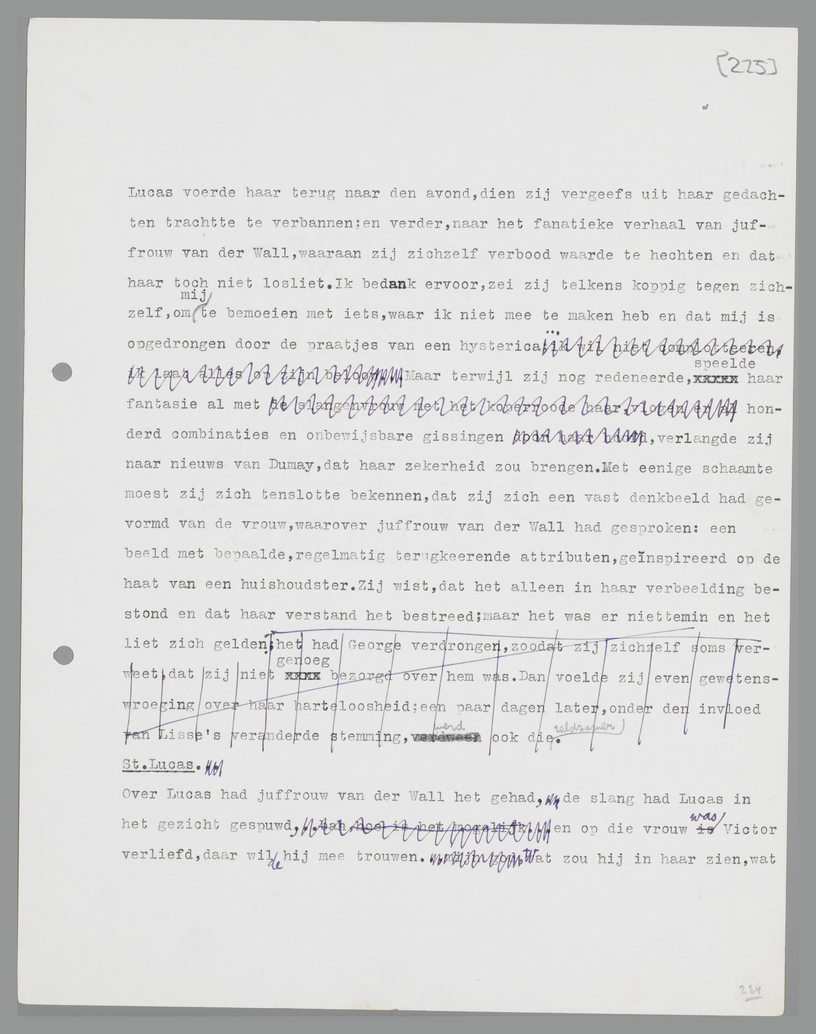 Zonder veel aandacht bladerde zij in één der nieuwe aanwinsten. Het was betrekkelijk laat en haar dag was vermoeiend geweest; de drie koningen in allerlei variaties, kruisigingen en grafleggingen gleden aan haar voorbij, tot zij op een reproductie stuitte, die haar door het onderschrift trof: St. Lucas de Heilige Maagd schilderend. Het was een middelmatig doek, naar de reproductie te oordelen; alleen het intelligente, verdiepte gezicht van de schilderende evangelist was enigszins opvallend; maar zij zou het niet hebben gezien, als de woorden onder de af beelding haar niet hadden vastgehouden. De naam Lucas voerde haar terug naar de avond, die zij vergeefs uit haar gedachten trachtte te verbannen; en verder, naar het fanatieke verhaal van juffrouw Van der Wall, waaraan zij zich verbood waarde te hechten en dat haar toch niet losliet. Ik bedank ervoor, zei zij telkens koppig tegen zichzelf, om mij te bemoeien met iets, waar ik niet mee te maken heb en dat mij is opgedrongen door de praatjes van een hysterica. ... Maar terwijl zij nog redeneerde, speelde haar fantasie al met honderd combinaties en onbewijsbare gissingen, verlangde zij naar nieuws van Dumay, dat haar zekerheid zou brengen. Met enige schaamte moest zij zich tenslotte bekennen, dat zij zich een vast denkbeeld had gevormd van de vrouw, waarover juffrouw Van der Wall had gesproken: een beeld met bepaalde, regelmatig terugkerende attributen, geïnspireerd op de haat van een huishoudster. Zij wist, dat het alleen in haar verbeelding bestond en dat haar verstand het bestreed; maar het was er niettemin en het liet zich gelden.