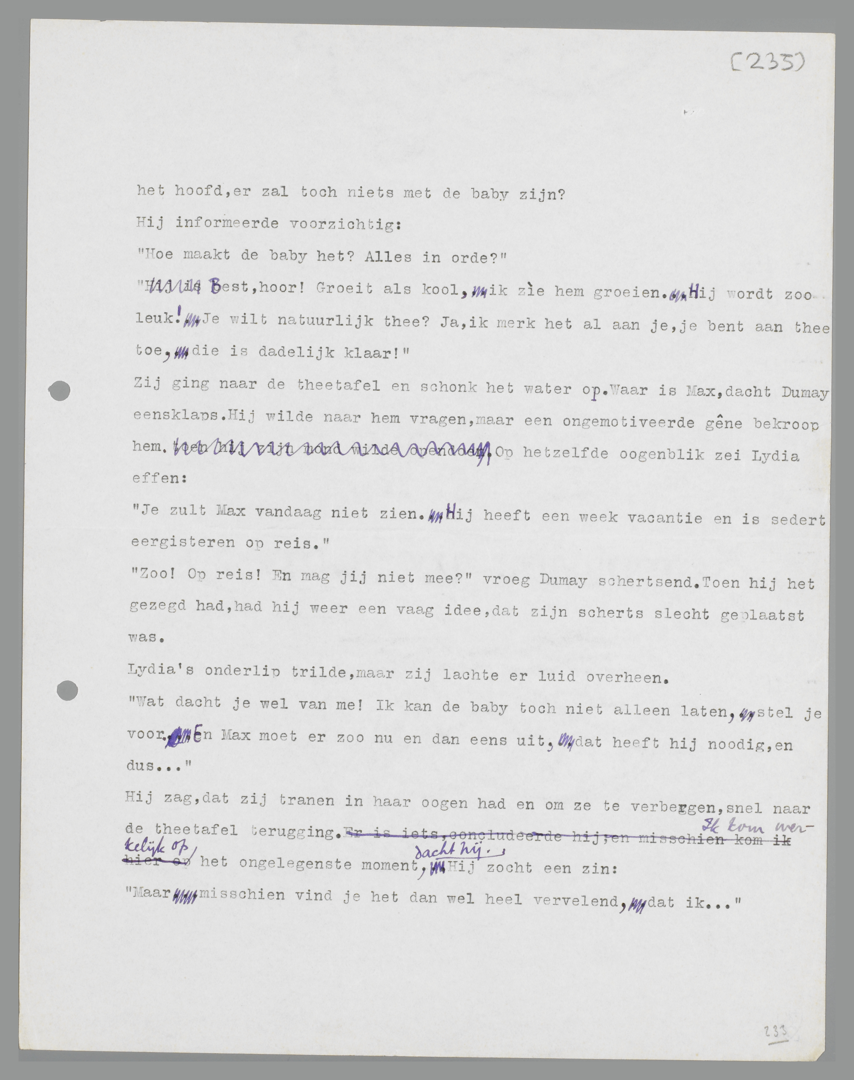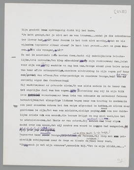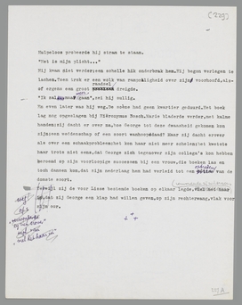 Nu zal ik aanstonds iets moeten doen, dacht zij zakelijk; iets belachelijks, iets corrects. Een klap misschien? Op zijn rechterwang dan, juist voor zijn oor. ... Zij wachtte en zag hem aan. George stond geen halve meter van haar af; de schaapachtige, onzekere uitdrukking in zijn ogen gaf haar een gevoel van afkeer. Een schaapachtige en onzekere George, bah! het was oneindig erger dan dronkenschap!