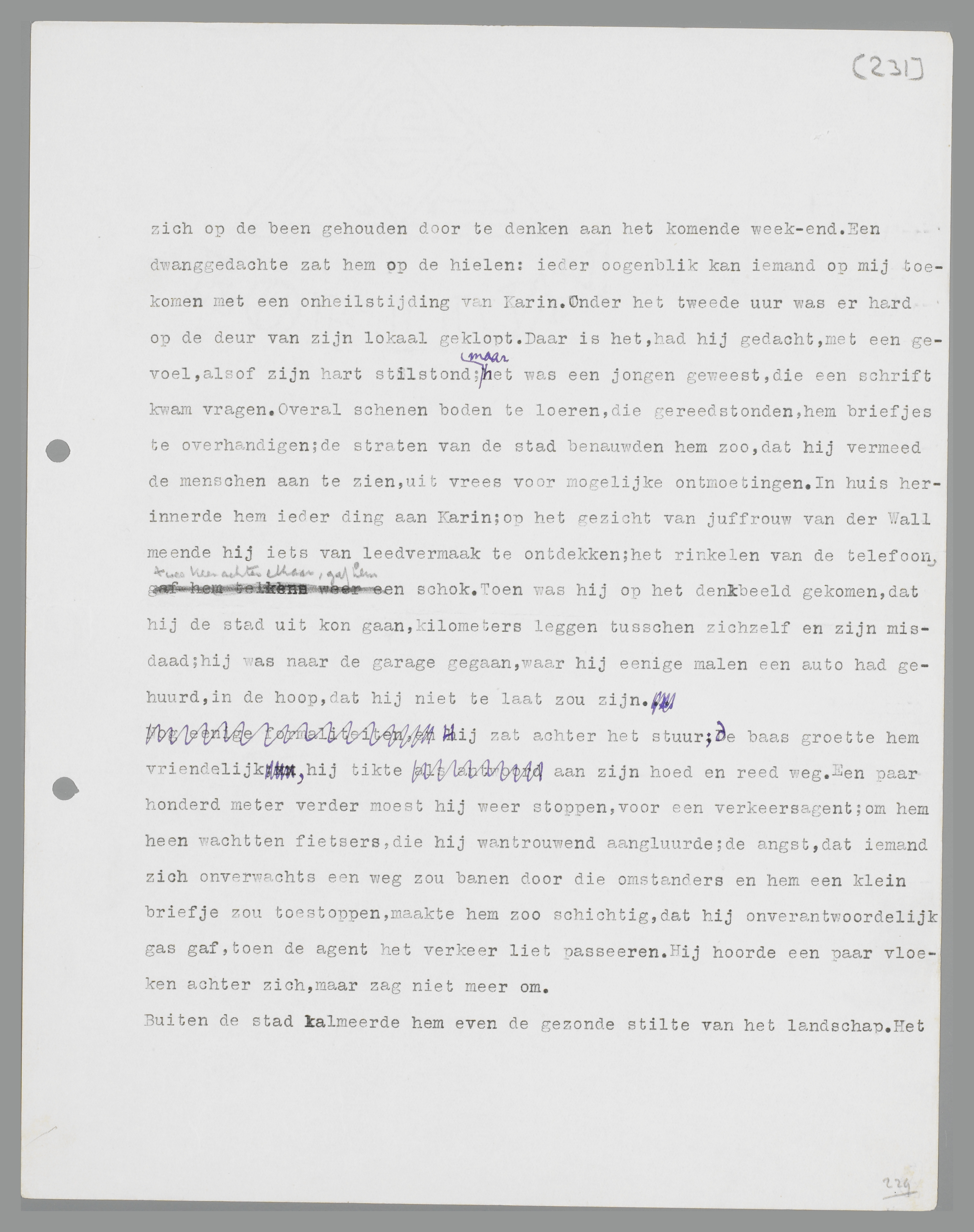 De ene sigaret na de andere oprokend liep hij voor de garage heen en weer, tot de baas het wagentje voorreed. Hij had zijn zenuwen nauwelijks meer in bedwang; hij had zich die nacht niet uitgekleed, bijna niet geslapen, de Zaterdagmorgen in versufte toestand voor de klas doorgebracht en zich op de been gehouden door te denken aan het komende week-end. Een dwanggedachte zat hem op de hielen: ieder ogenblik kan iemand op mij toekomen met een onheilstijding van Karin. Onder het tweede uur was er hard op de deur van zijn lokaal geklopt. Daar is het, had hij gedacht, met een gevoel, alsof zijn hart stilstond; maar het was een jongen geweest, die een schrift kwam vragen. Overal schenen boden te loeren, die gereedstonden hem briefjes te overhandigen; de straten van de stad benauwden hem zo, dat hij vermeed de mensen aan te zien, uit vrees voor mogelijke ontmoetingen. In huis herinnerde hem ieder ding aan Karin; op het gezicht van juffrouw Van der Wall meende hij iets van leedvermaak te ontdekken; het rinkelen van de telefoon, twee keer achter elkaar, gaf hem een schok. Toen was hij op het denkbeeld gekomen, dat hij de stad uit kon gaan, kilometers leggen tussen zichzelf en zijn misdaad; hij was naar de garage gegaan, waar hij enige malen een auto had gehuurd, in de hoop, dat hij niet te laat zou zijn.