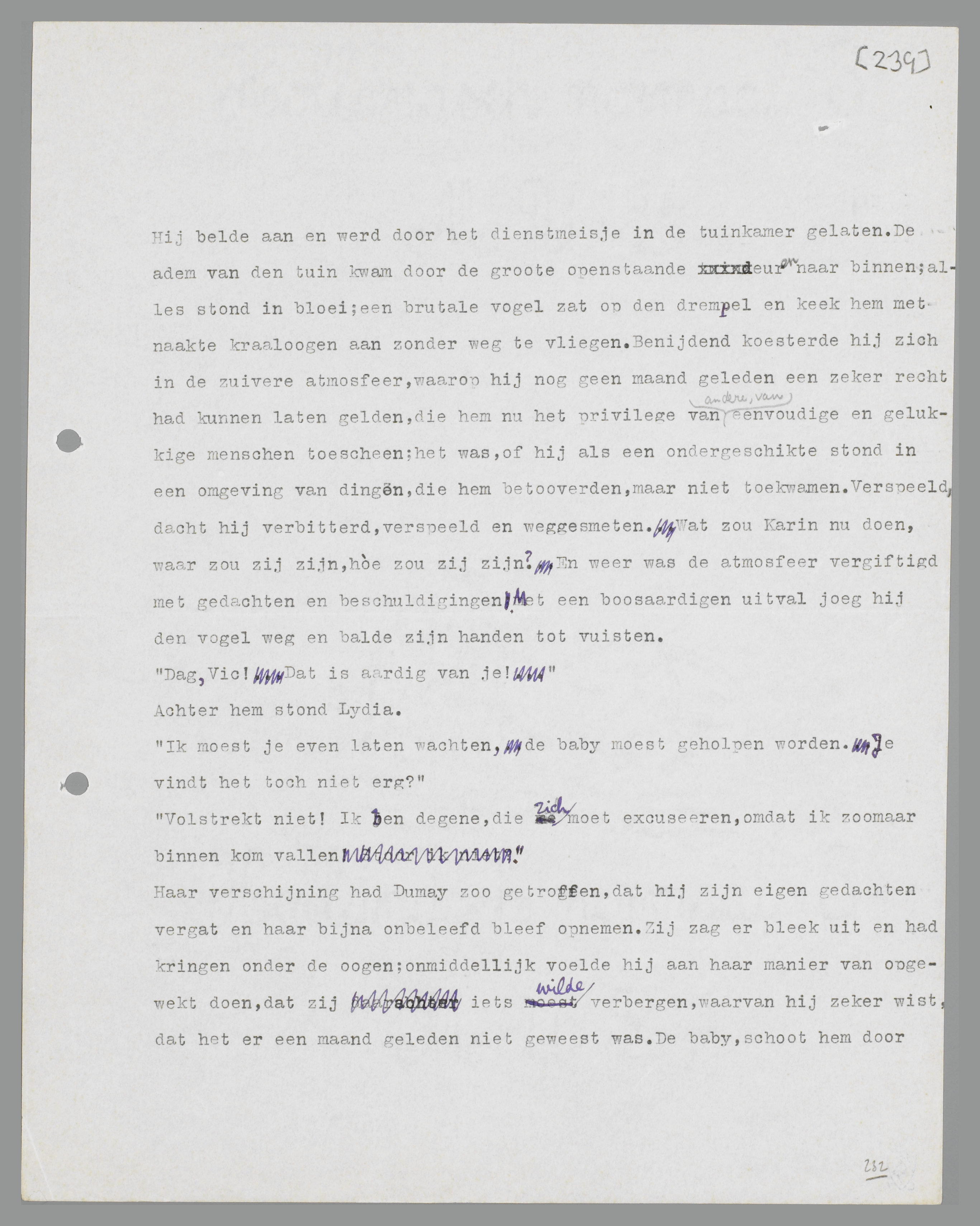 Hij belde aan en werd door het dienstmeisje in de tuinkamer gelaten. De adem van de tuin kwam door de grote openstaande deuren naar binnen; alles stond in bloei; een brutale vogel zat op de drempel en keek hem met naakte kraalogen aan zonder weg te vliegen. Benijdend koesterde hij zich in de zuivere atmosfeer, waarop hij nog geen maand geleden een zeker recht had kunnen laten gelden, die hem nu het privilege van andere, van eenvoudige en gelukkige mensen toescheen; het was, of hij als een ondergeschikte stond in een omgeving van dingen, die hem betoverden, maar niet toekwamen. Verspeeld, dacht hij verbitterd, verspeeld en weggesmeten. Wat zou Karin nu doen, waar zou zij zijn, hòe zou zij zijn? En weer was de atmosfeer vergiftigd met gedachten en beschuldigingen. Met een boosaardige uitval joeg hij de vogel weg en balde zijn handen tot vuisten.