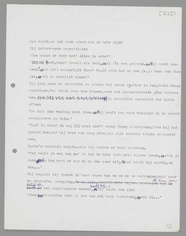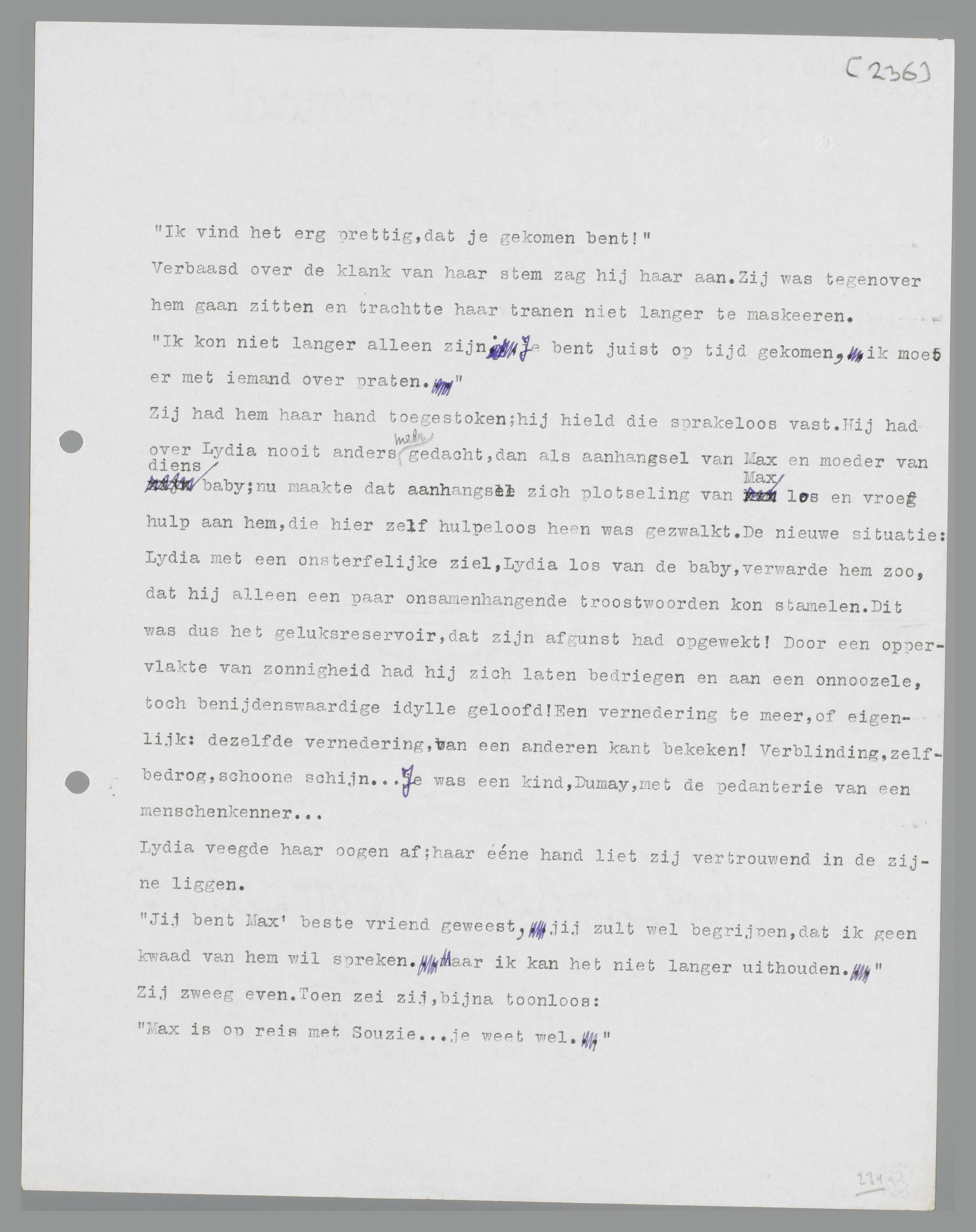 Zij had hem haar hand toegestoken; hij hield die sprakeloos vast. Hij had over Lydia nooit meer anders gedacht, dan als aanhangsel van Max en moeder van diens baby; nu maakte dat aanhangsel zich plotseling van Max los en vroeg hulp aan hem, die hier zelf hulpeloos heen was gezwalkt. De nieu we situatie: Lydia met een onsterfelijke ziel, Lydia los van de baby, verwarde hem zo, dat hij alleen een paar onsamenhangende troostwoorden kon stamelen. Dit was dus het geluksreservoir, dat zijn afgunst had opgewekt! Door een oppervlakte