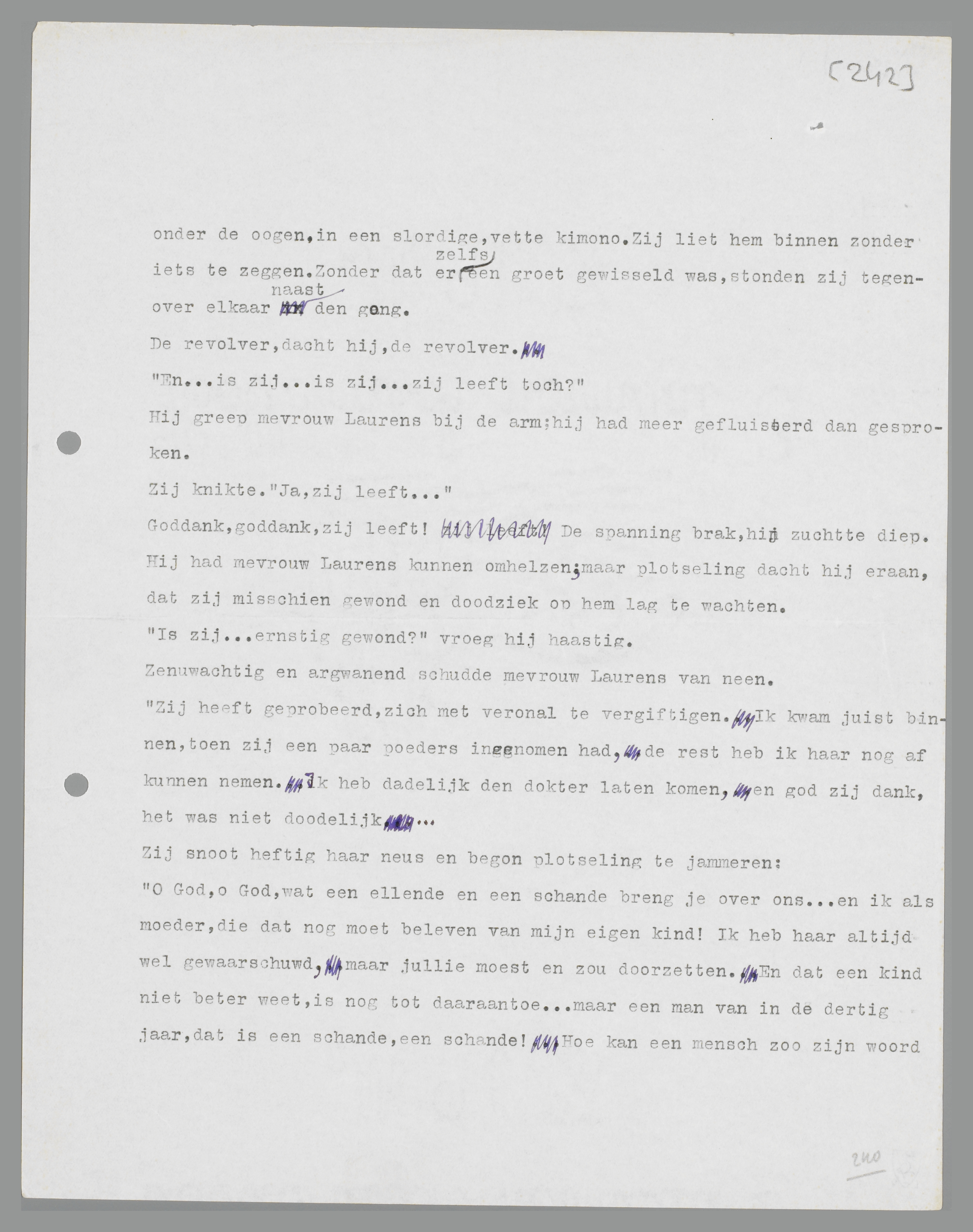 ‘Zij heeft geprobeerd, zich met veronal te vergiftigen. Ik kwam juist binnen, toen zij een paar poeiers ingenomen had, de rest heb ik haar nog af kunnen nemen. Ik heb dadelijk de dokter laten komen, en god zij dank, het was niet dodelijk. ...’